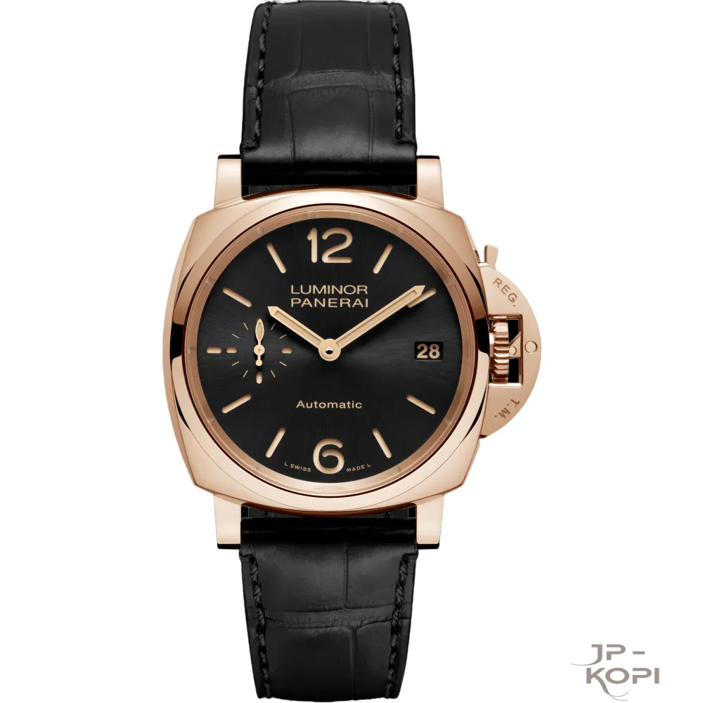 パネライ ルミノール ドゥエ PAM00908は、直径38mmというコンパクトなサイズ感が魅力のモデルです。クラシックなブラックダイヤルとローズゴールドメッキケースの組み合わせが上品で、日常使いにもフォーマルにもマッチします。