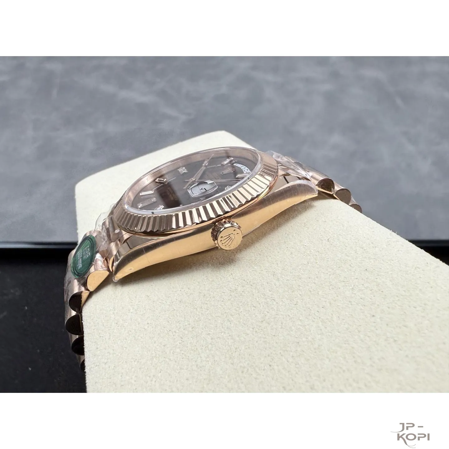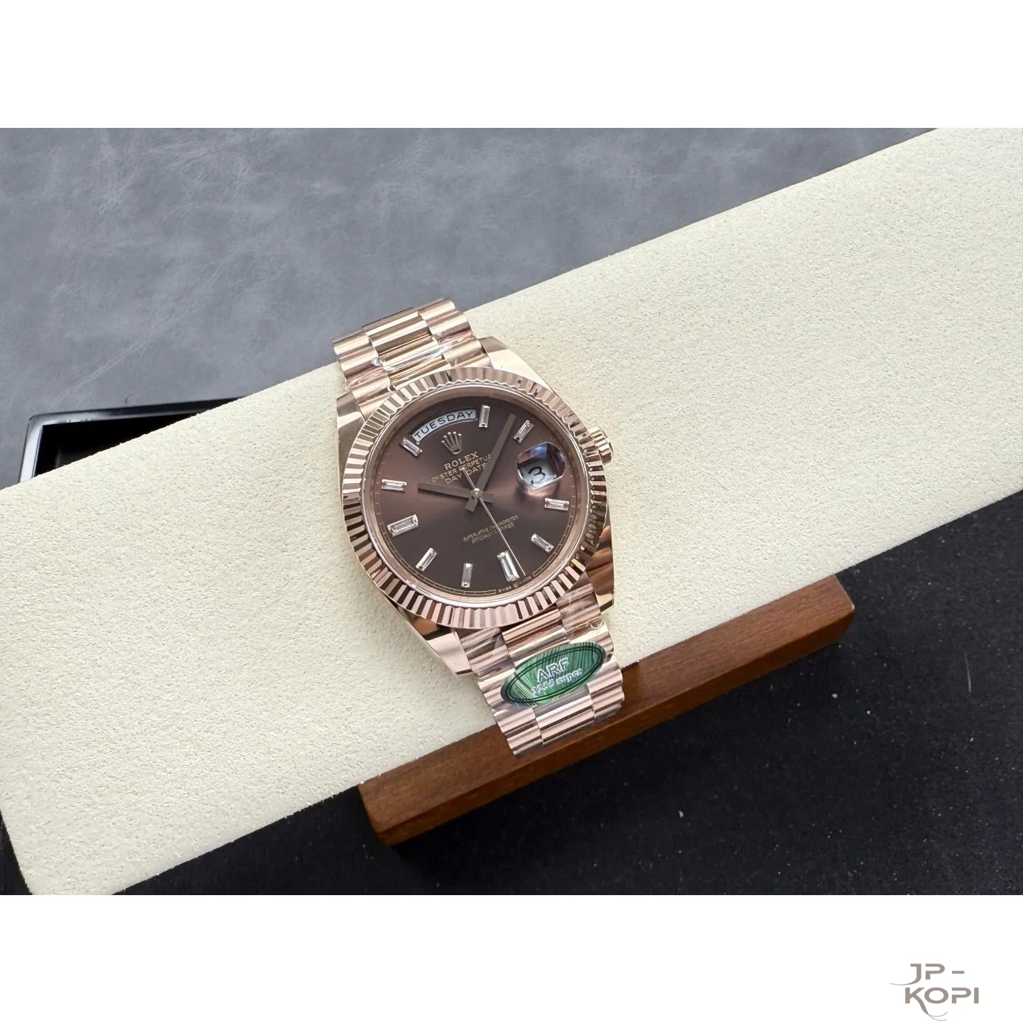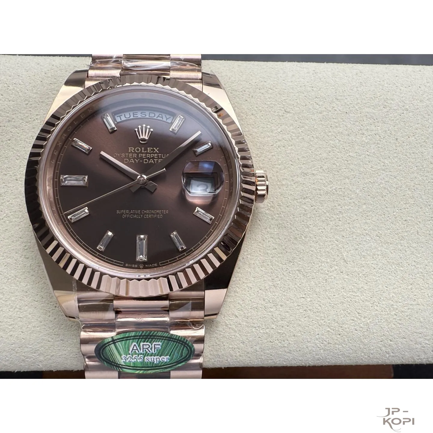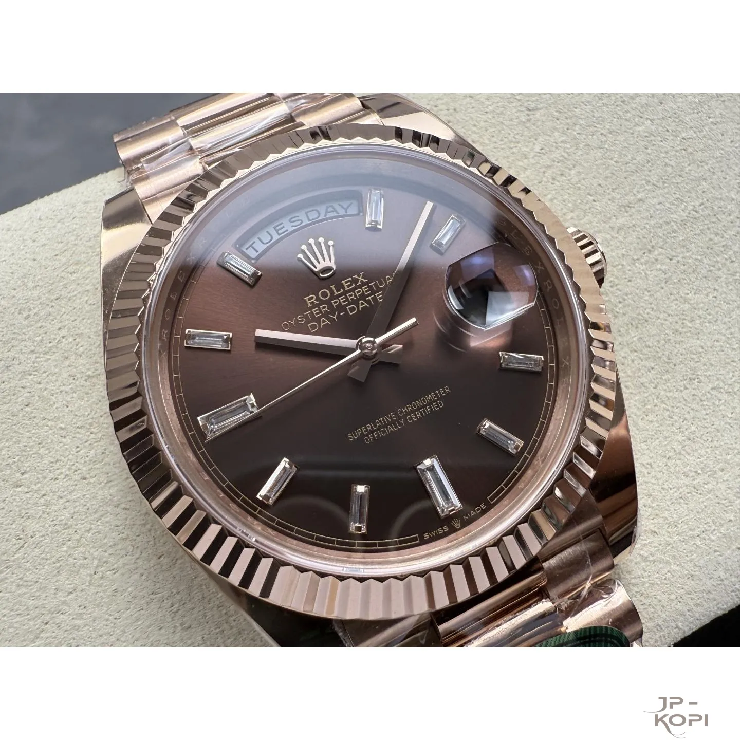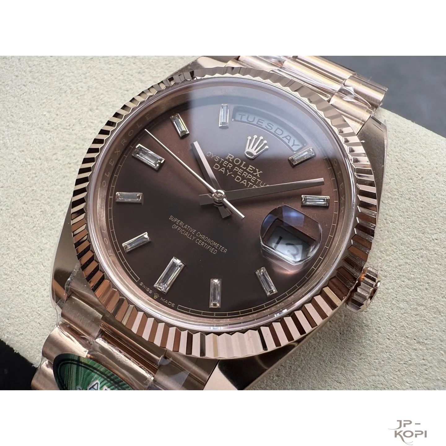 ロレックス デイデイト 40mm M228235-0003は、上品で深みのあるチョコレートダイヤルに、ダイヤモンドインデックスを贅沢にあしらったエレガントなモデルです。