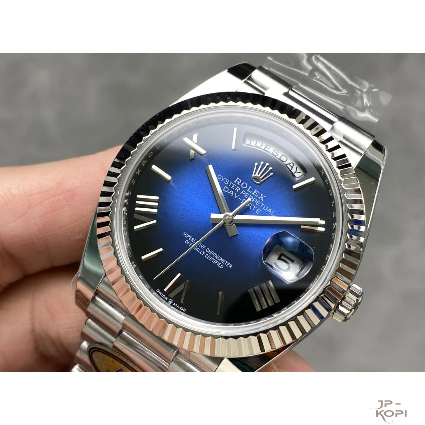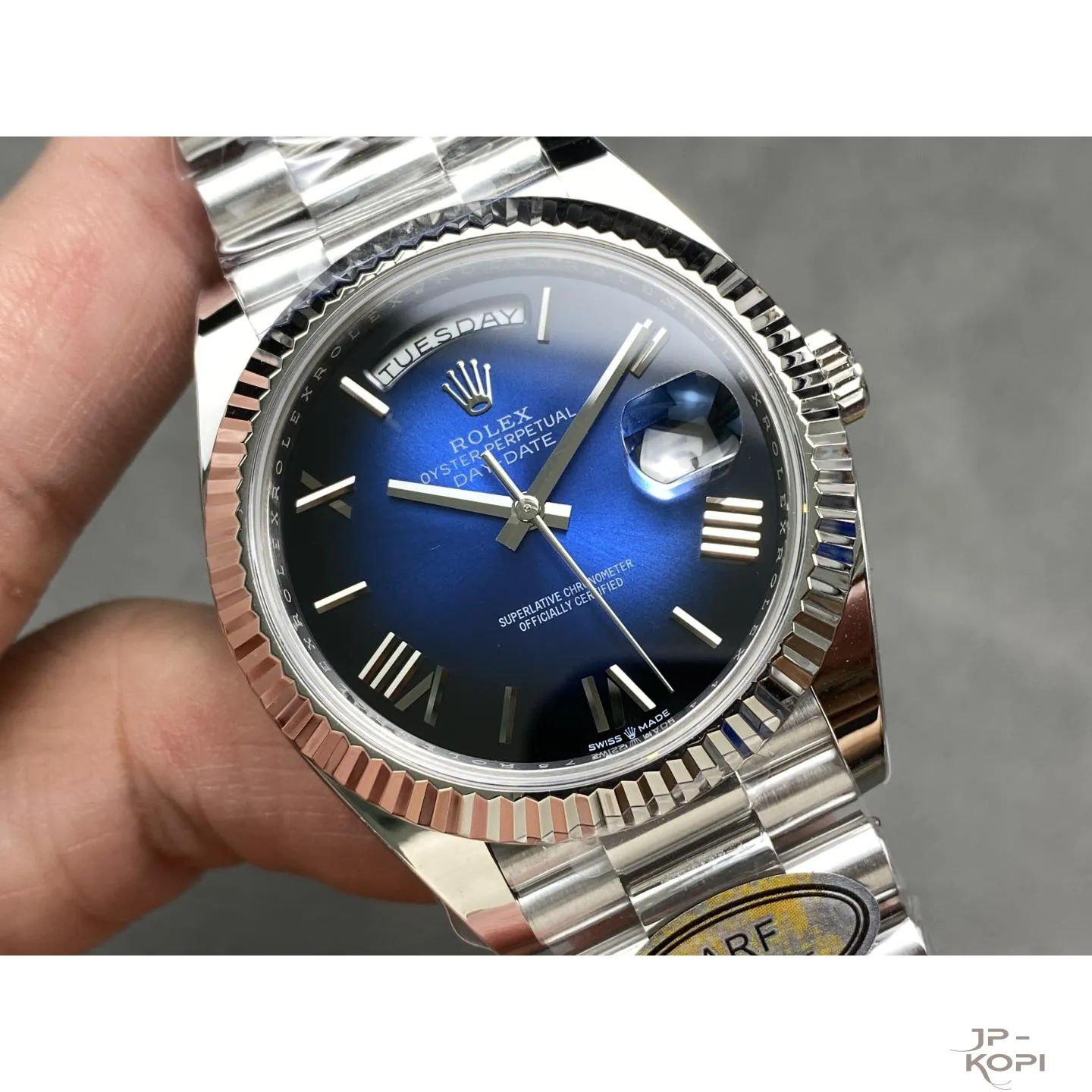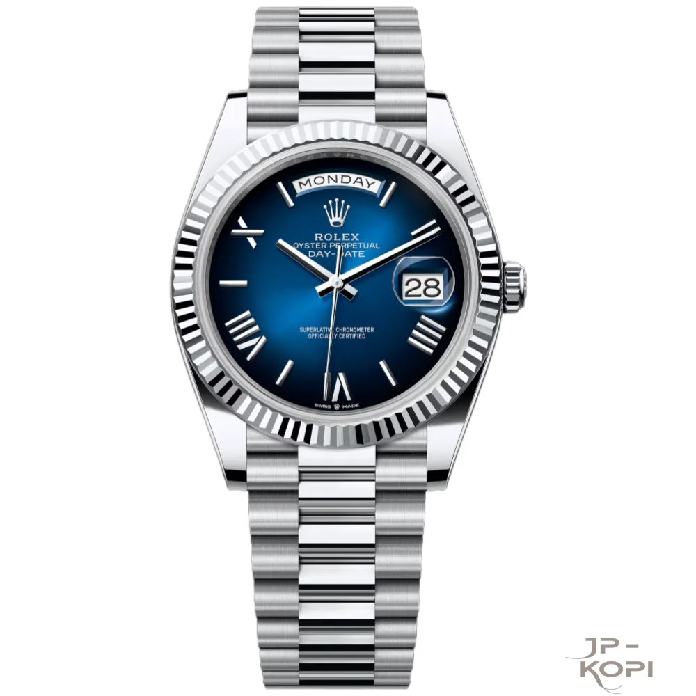 ロレックス デイデイト 40mm M228236-0024は、鮮やかなブルーオンブレ文字盤にローマ数字を配置した、落ち着きと高級感を兼ね備えたモデルです。