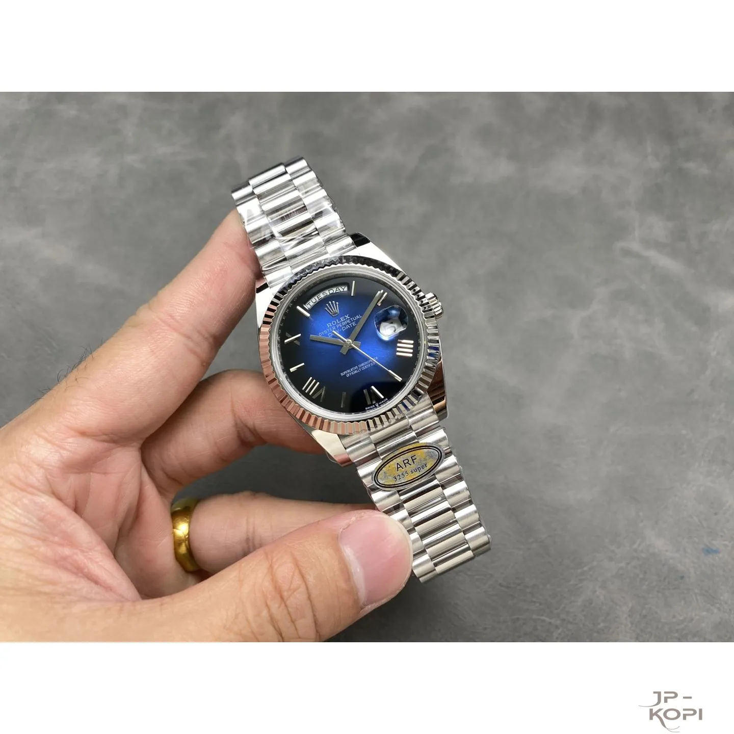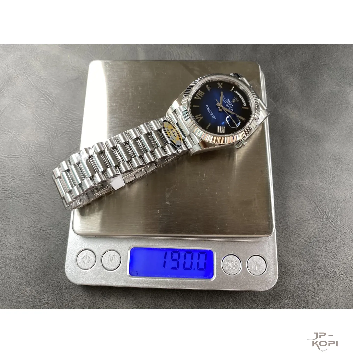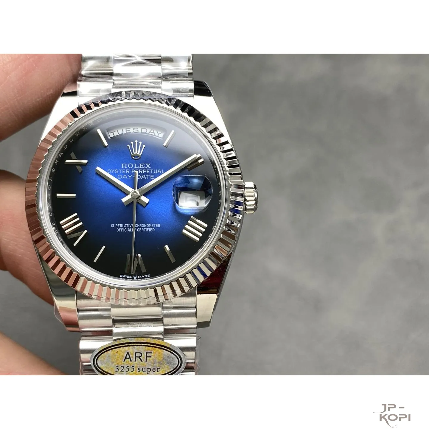 ロレックス デイデイト 40mm M228236-0024は、鮮やかなブルーオンブレ文字盤にローマ数字を配置した、落ち着きと高級感を兼ね備えたモデルです。