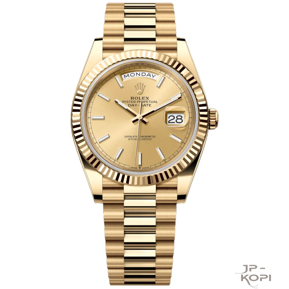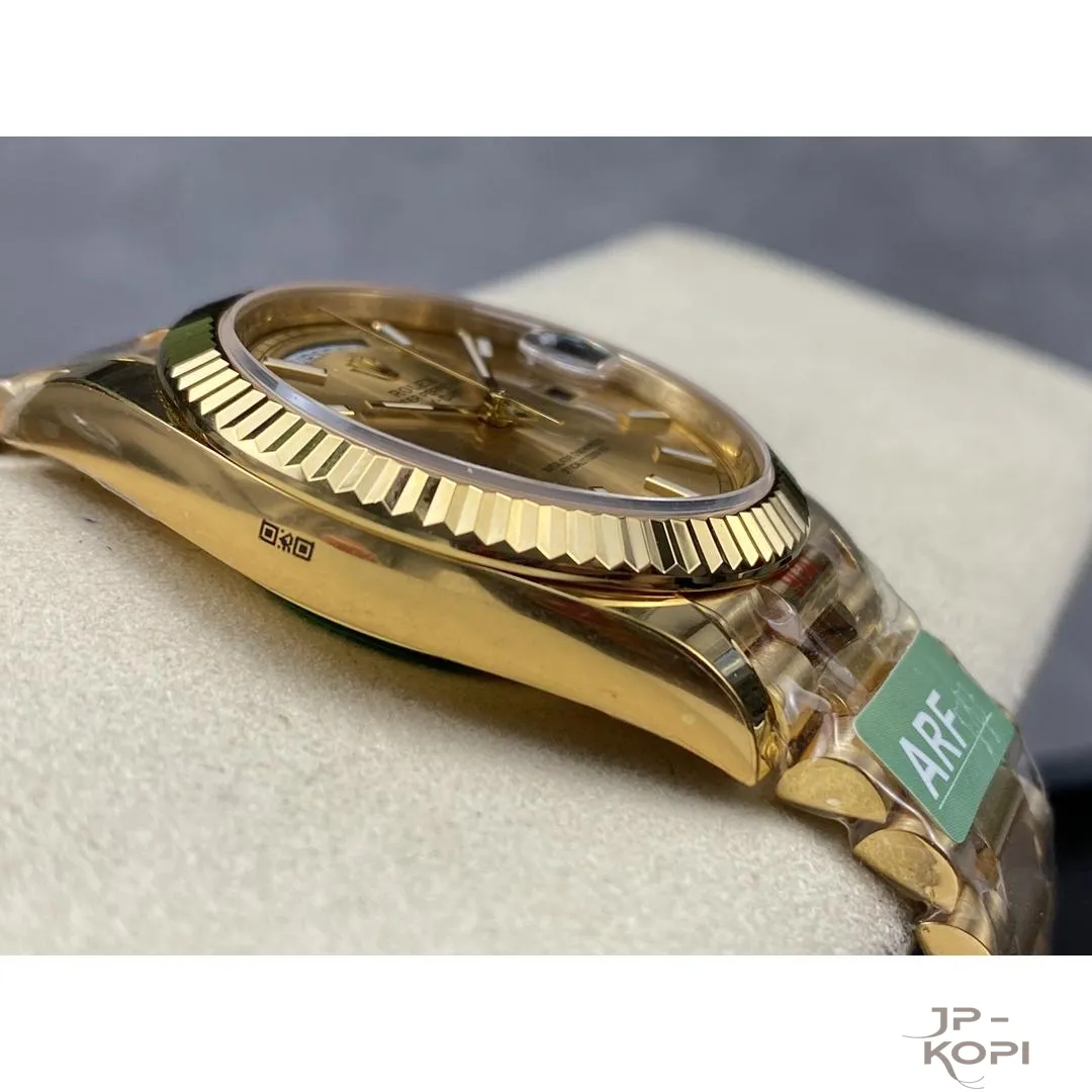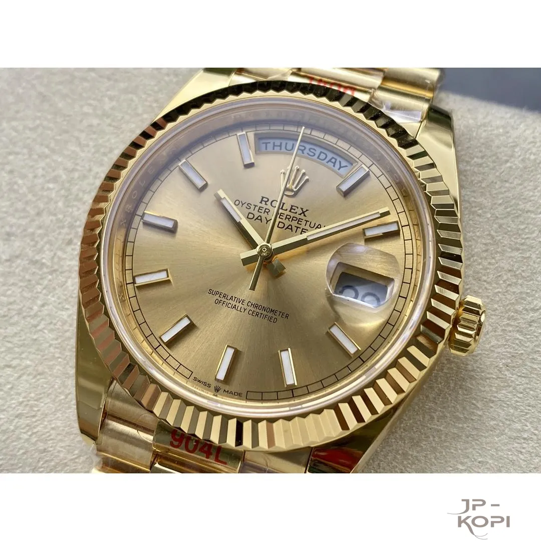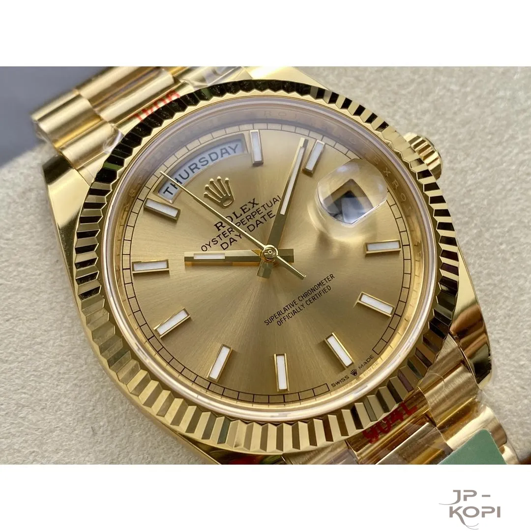 ロレックス デイデイト 40mm M228238-0003は、ラグジュアリー感を象徴するシャンパンダイアルを採用したモデル。