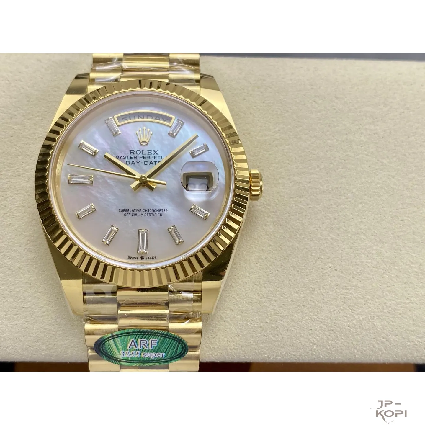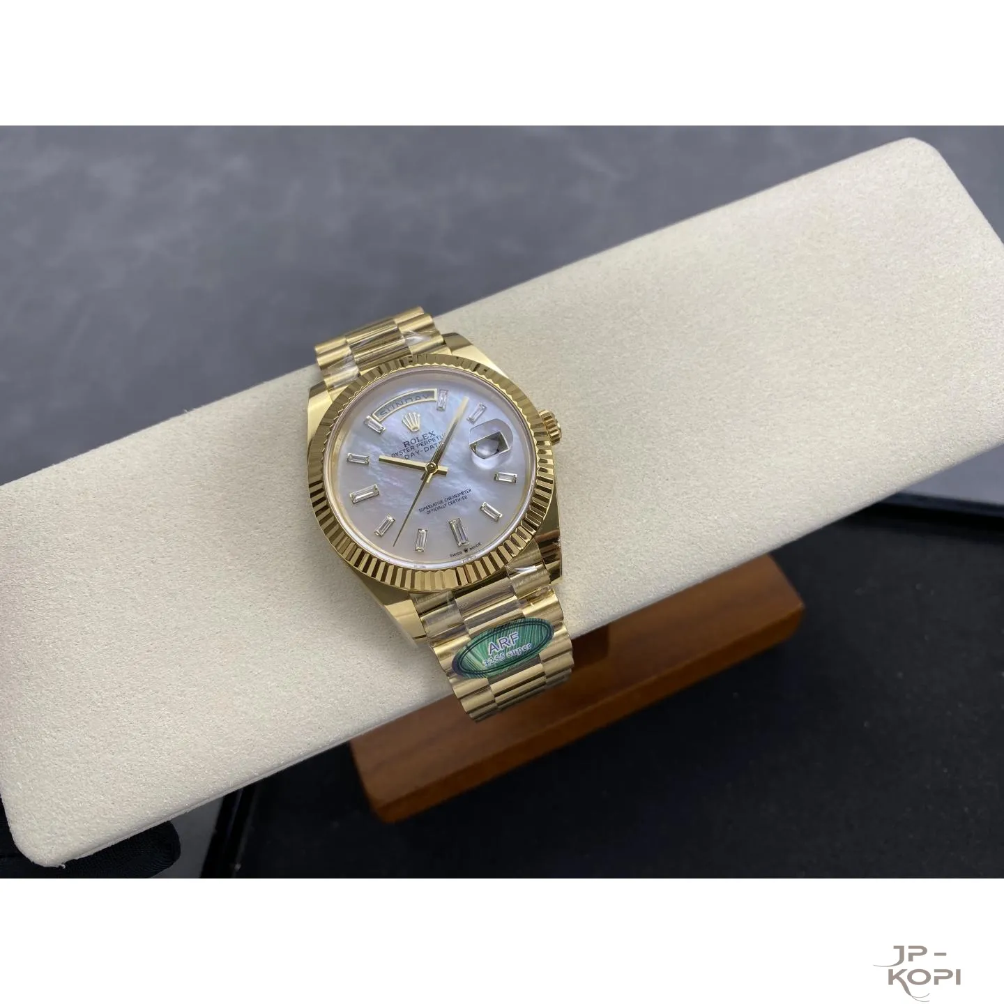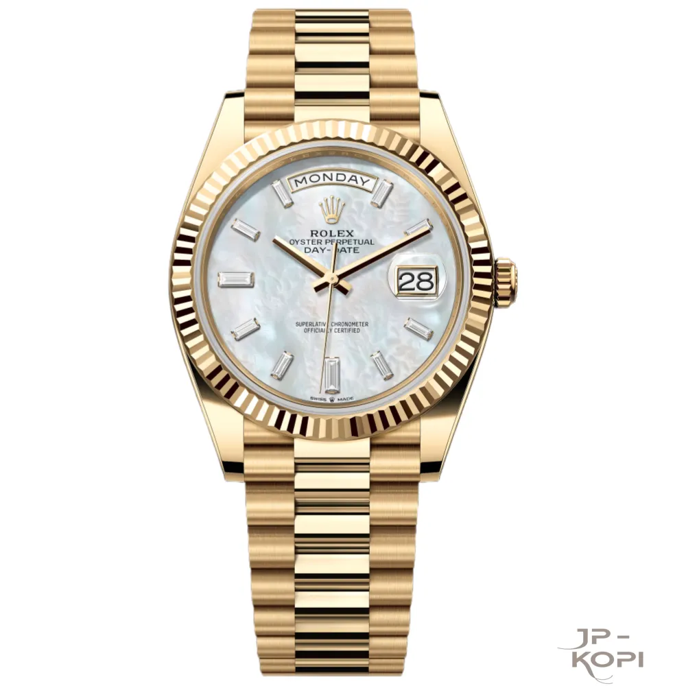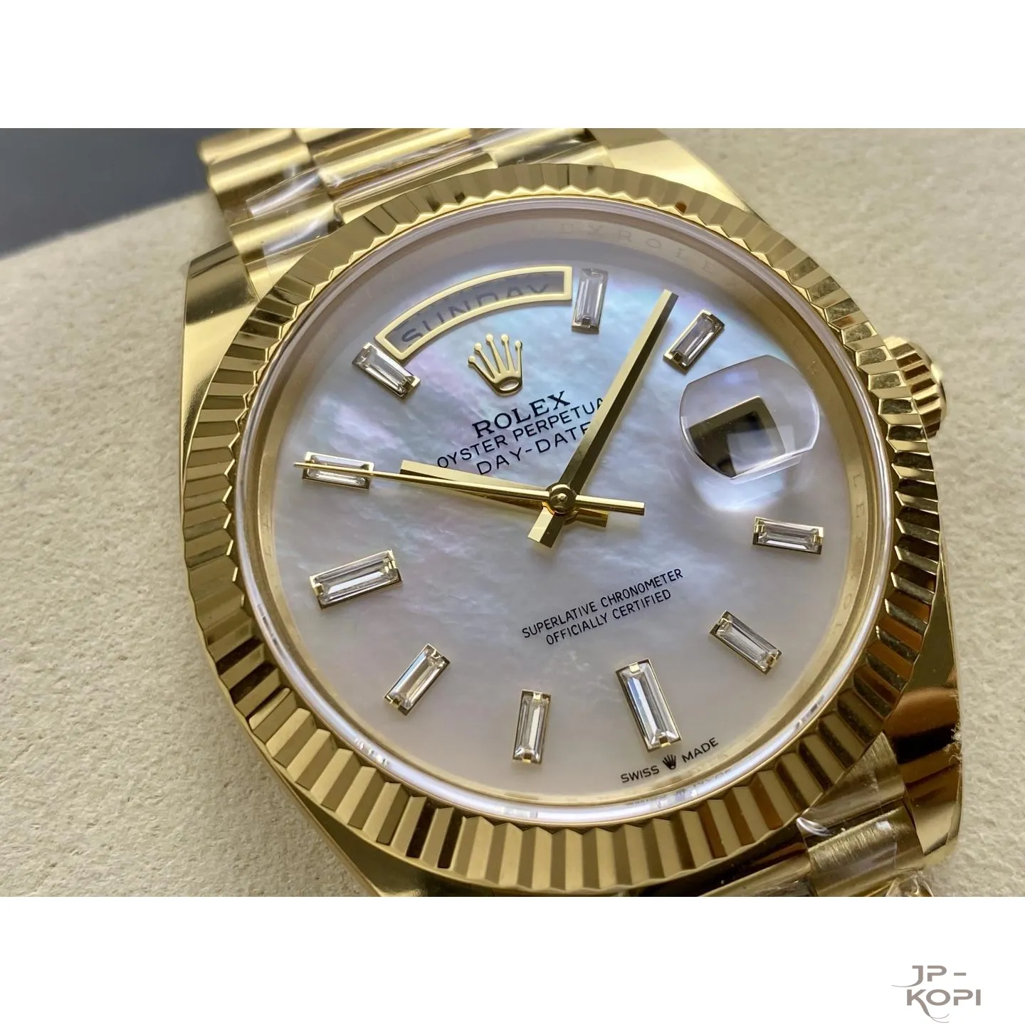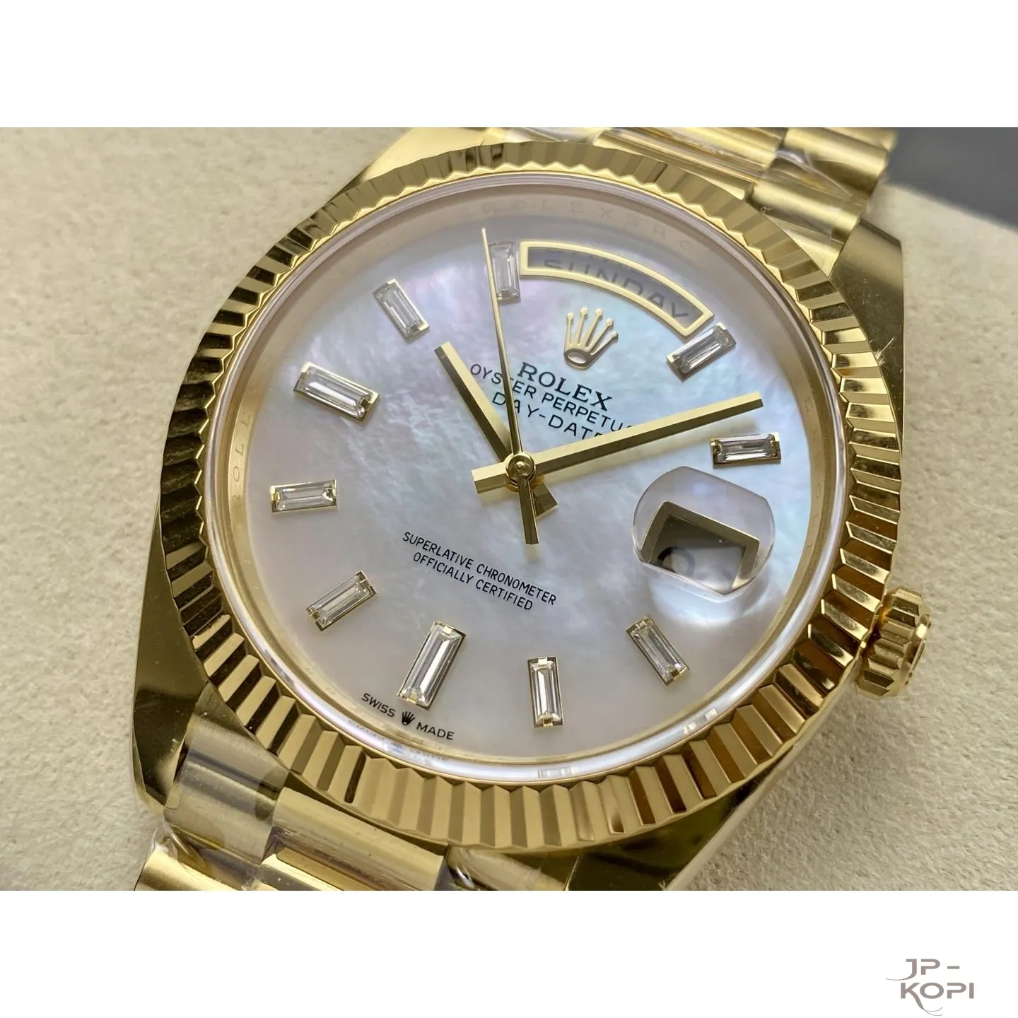 ロレックス デイデイト 40mm M228238-0071は、上品で幻想的な輝きを放つホワイトマザーオブパール文字盤に、ダイヤモンドインデックスをあしらったラグジュアリーモデルです。