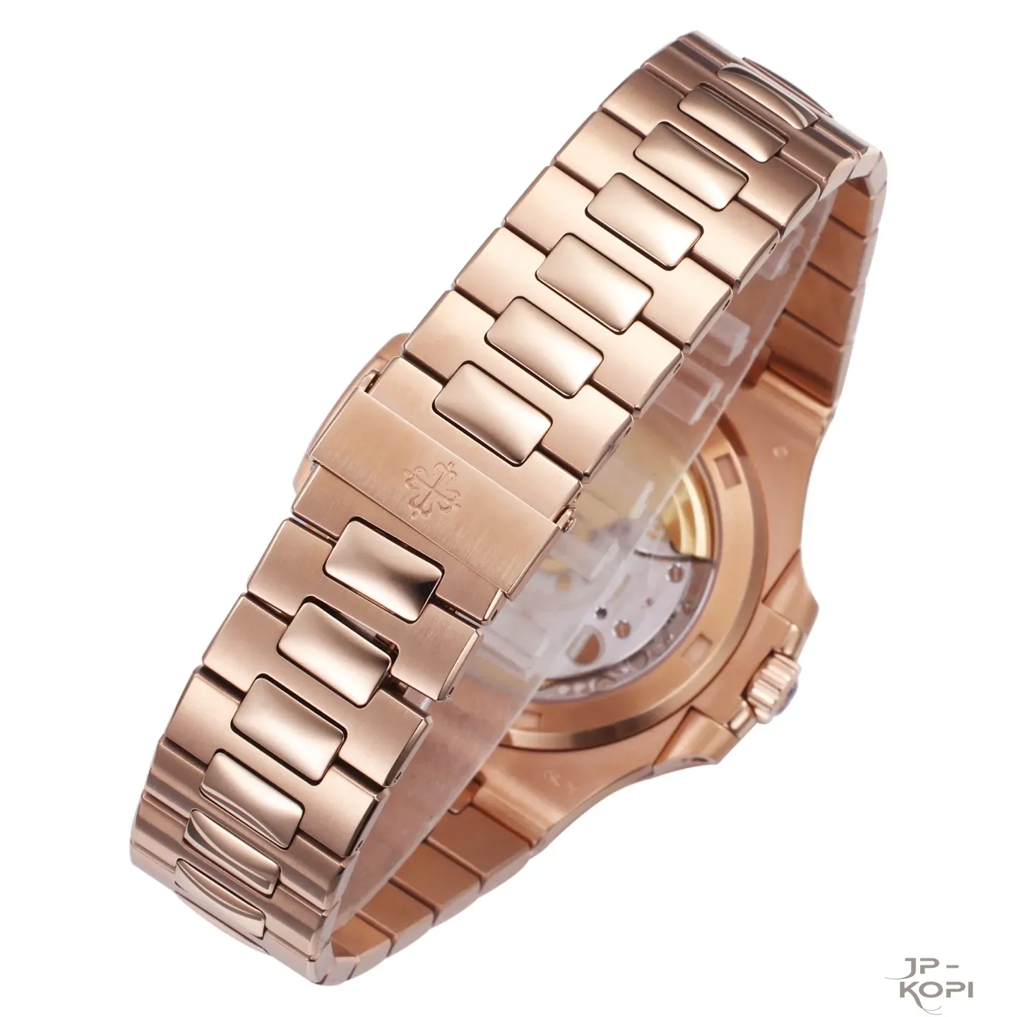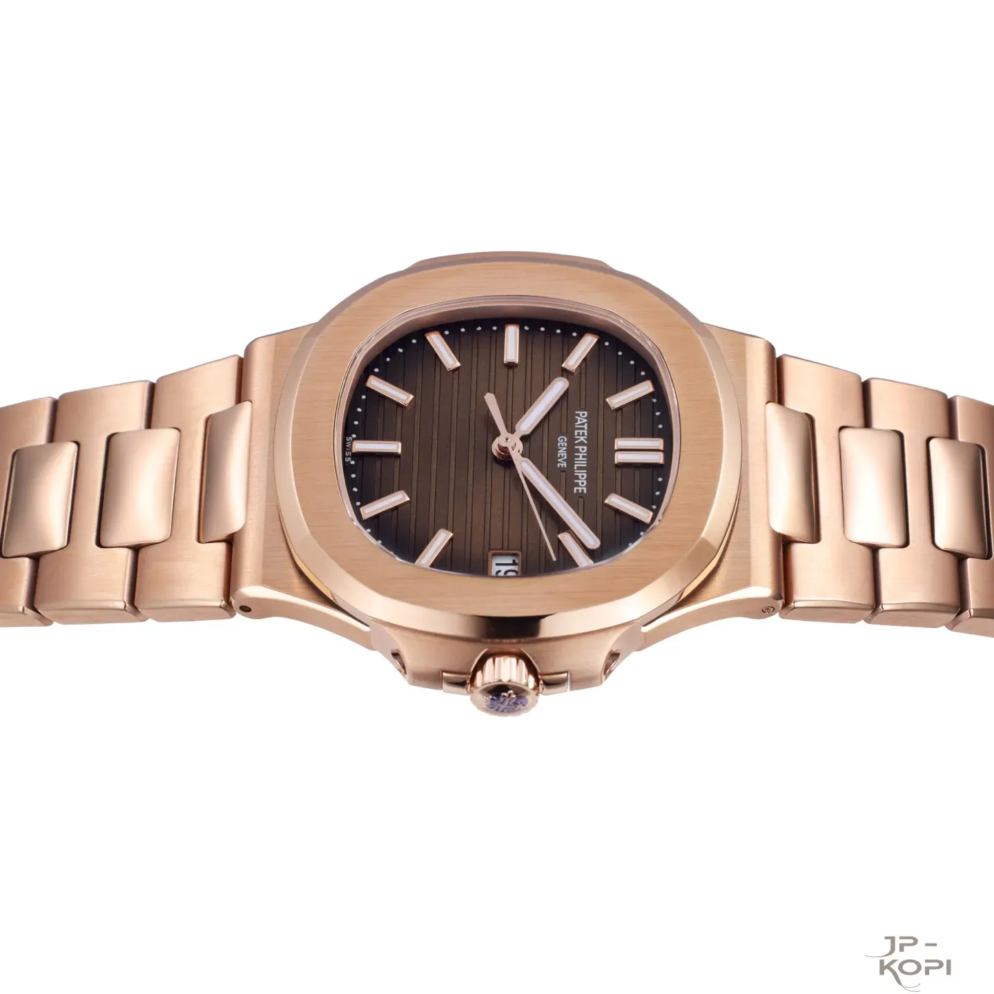 美しいサンバーストブラウン文字盤に加え、丹東Cal.324自動巻きムーブメントを搭載し、約45時間のパワーリザーブを実現。904LステンレスにローズゴールドPVDメッキを施したケースとブレスレット、サファイヤクリスタル・バック仕様、そして120mの防水性能を備えた完成度の高い一本です。