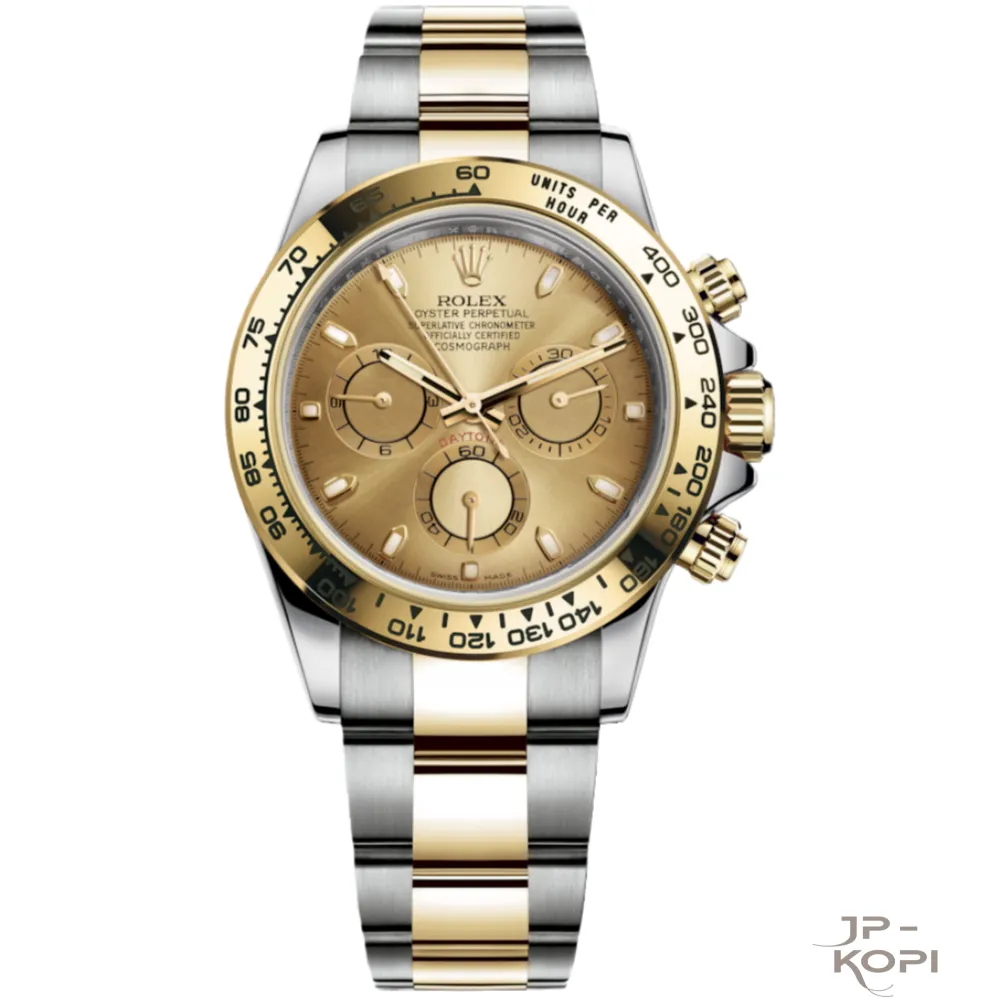 シャンパンカラーのダイアルとイエローゴールドメッキが融合した華やかなデザインは、正規品と見分けがつかないほどの完成度を誇ります。