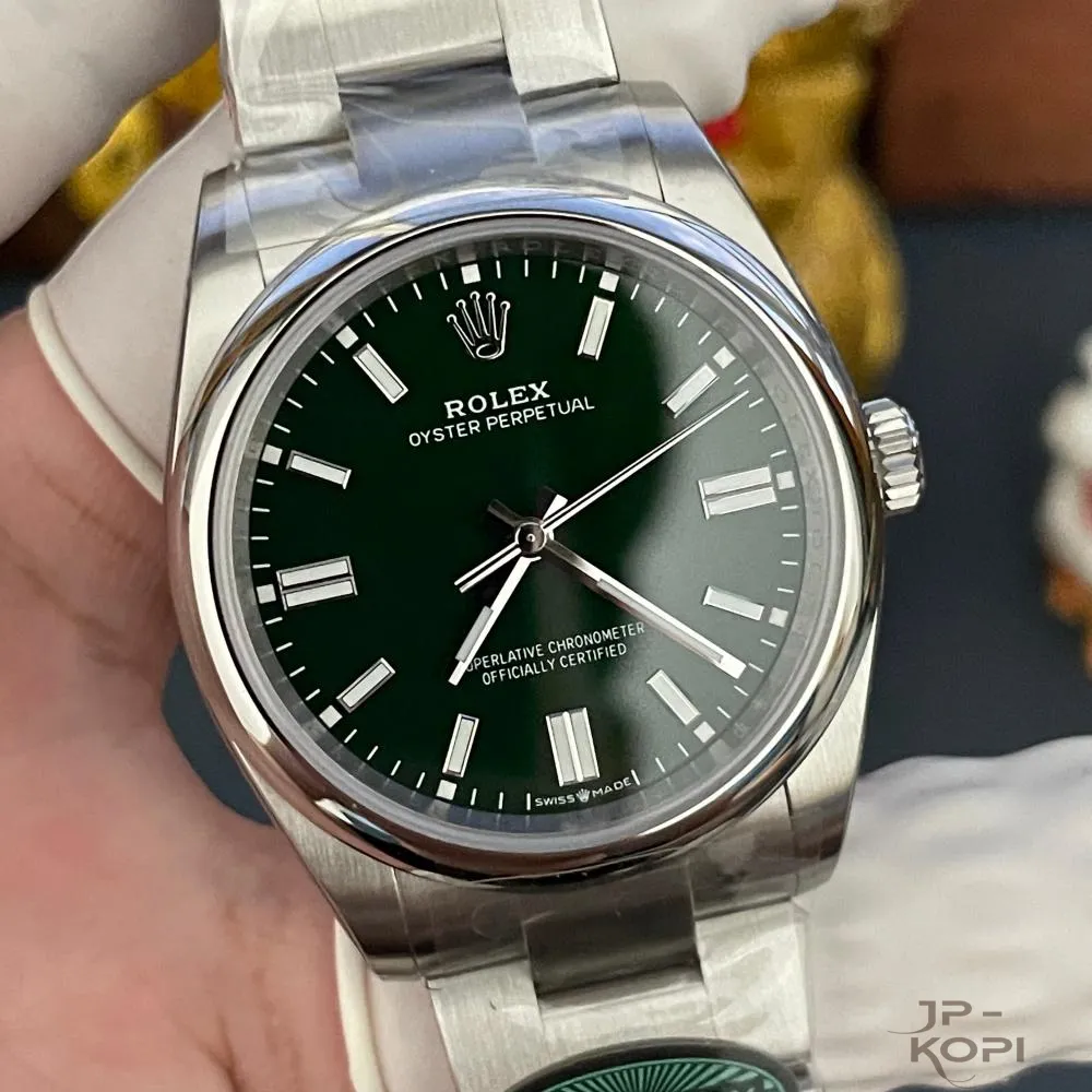鮮やかなグリーンダイアルが印象的なロレックス「オイスターパーペチュアル」。