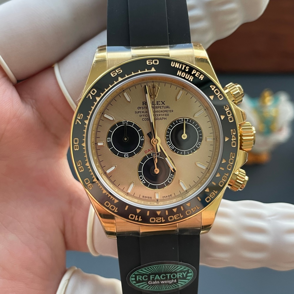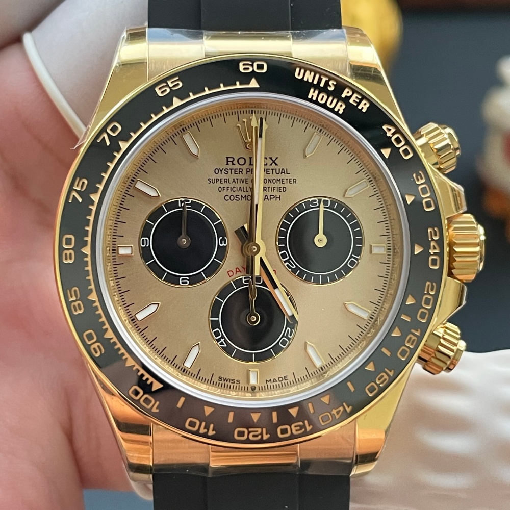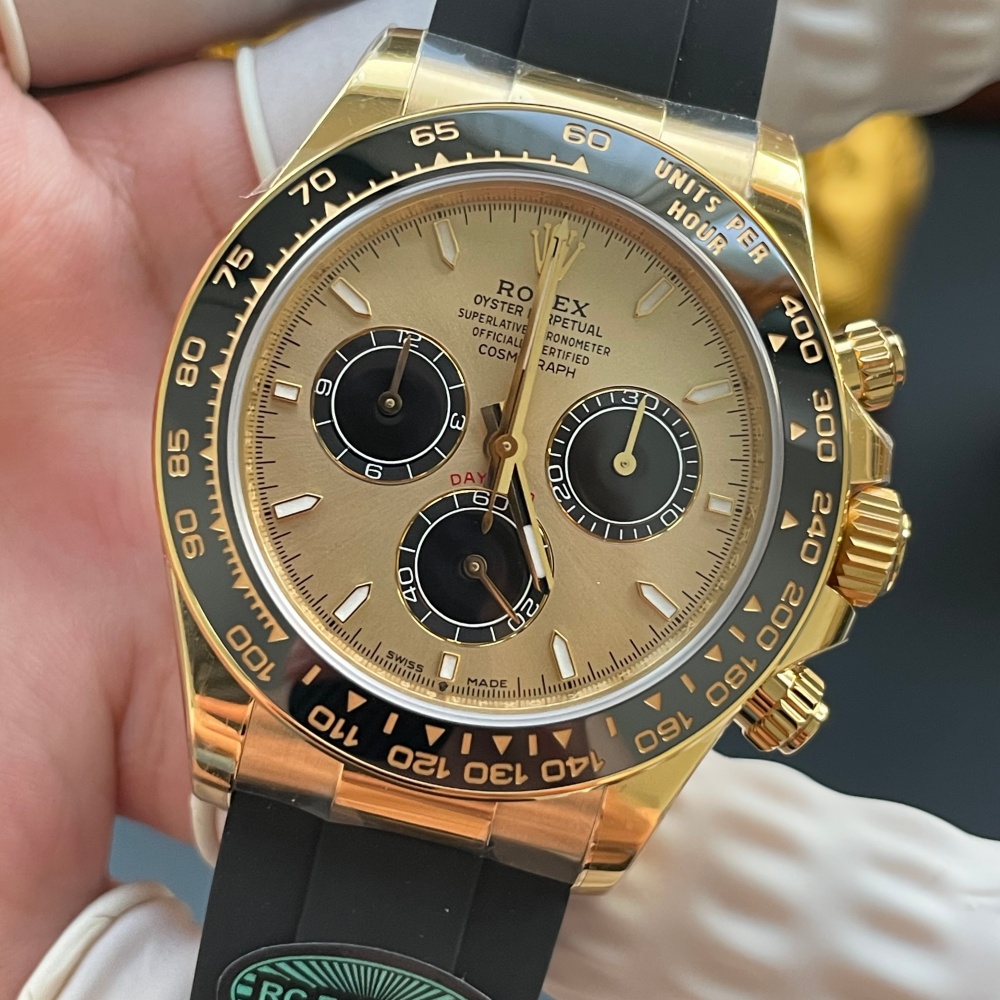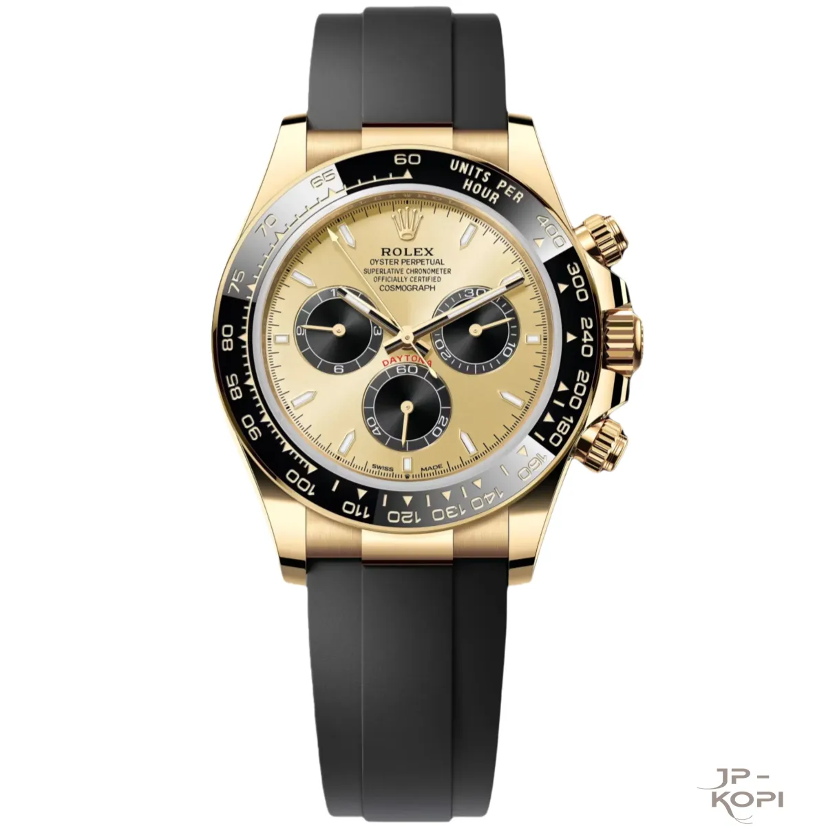 ロレックス コスモグラフ デイトナ m126518ln-0012は、ラグジュアリーなゴールデン&ブライトブラックダイアルと、スポーティーなラバーストラップを組み合わせた人気モデルです。