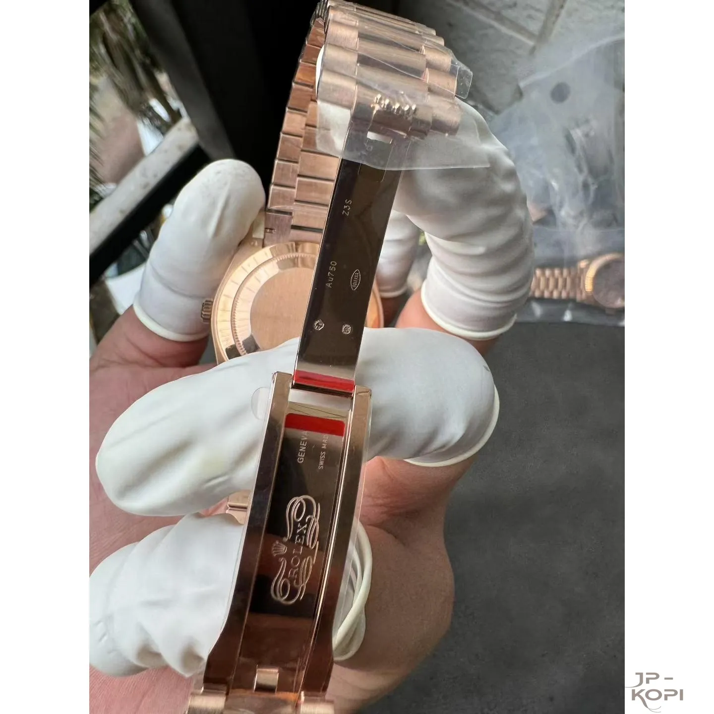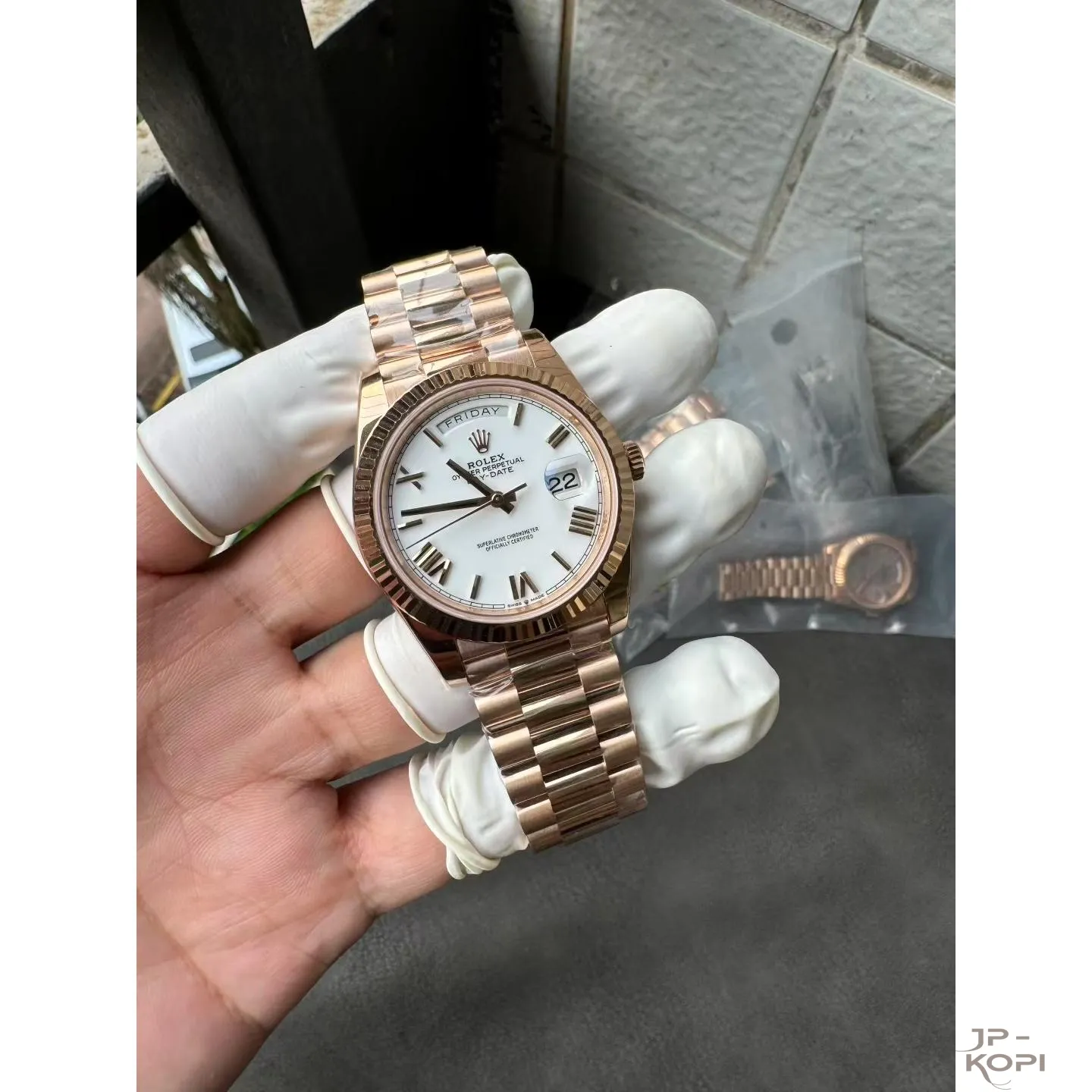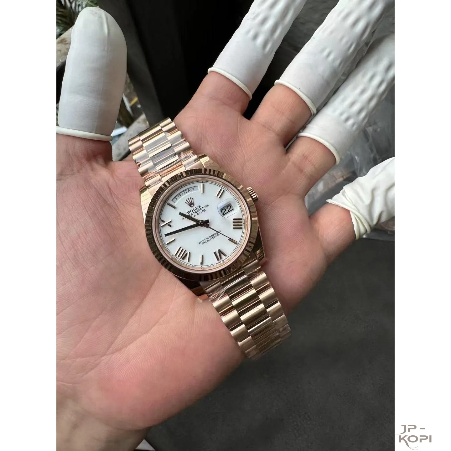 ケース・ベゼル・ブレスレットには904Lステンレス(ローズゴールドメッキ仕様)を使用し、加重版 約210gのしっかりとした高級感ある仕上がりです。ベゼルはロレックスならではのフルーテッド仕様で、光の反射が美しく輝きます。