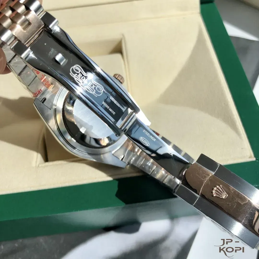 ジュビリーブレスには904Lステンレス+エバーローズゴールドを使用し、快適な装着感と高級感を両立。