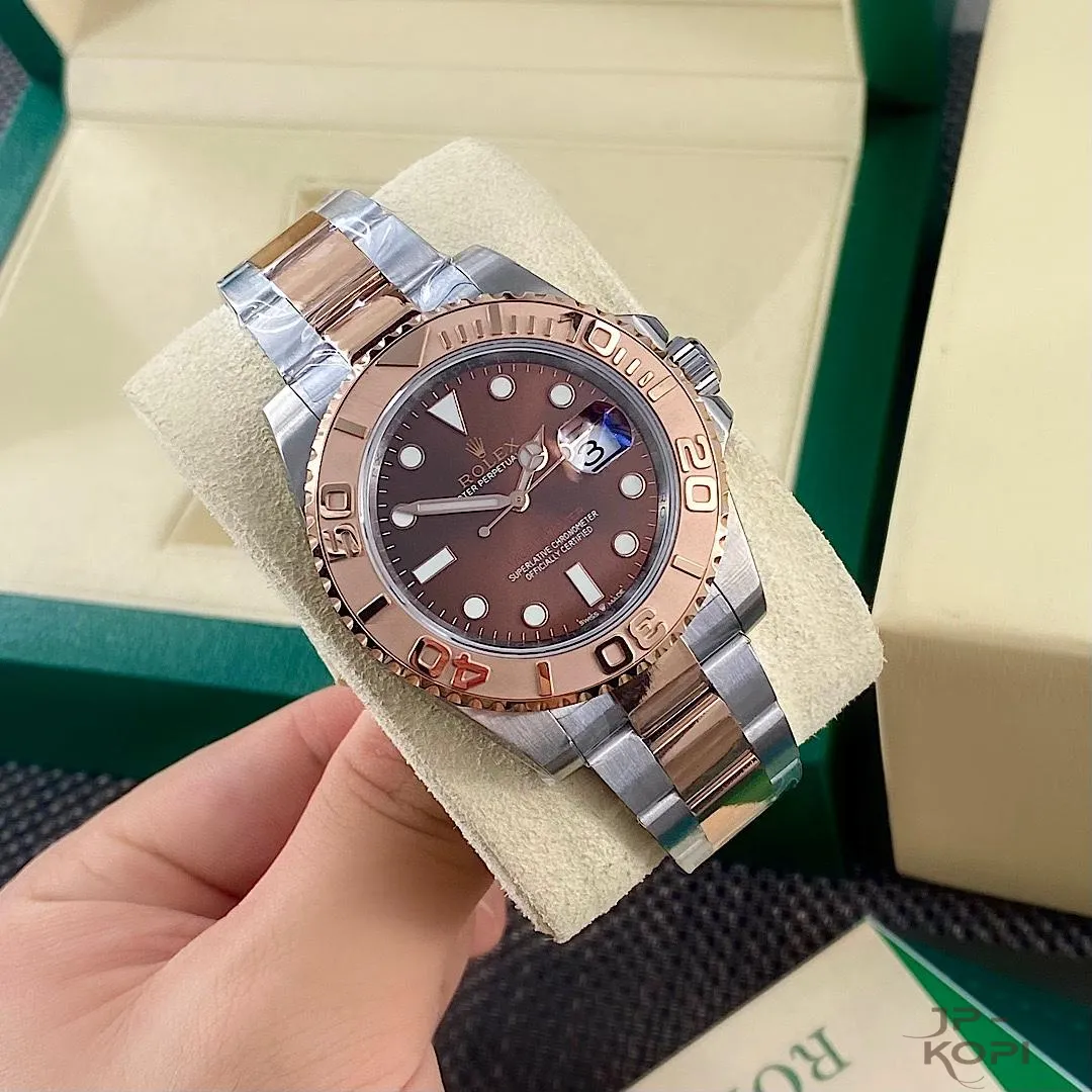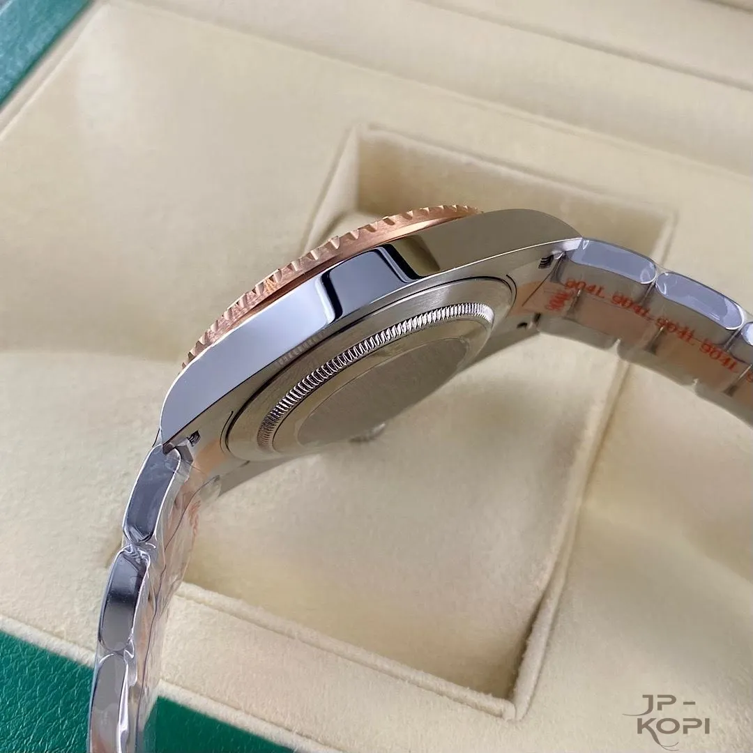 エレガントなチョコレート文字盤とエバーローズゴールドメッキ×904Lステンレス製回転ベゼルの組み合わせが、洗練された印象を演出します。