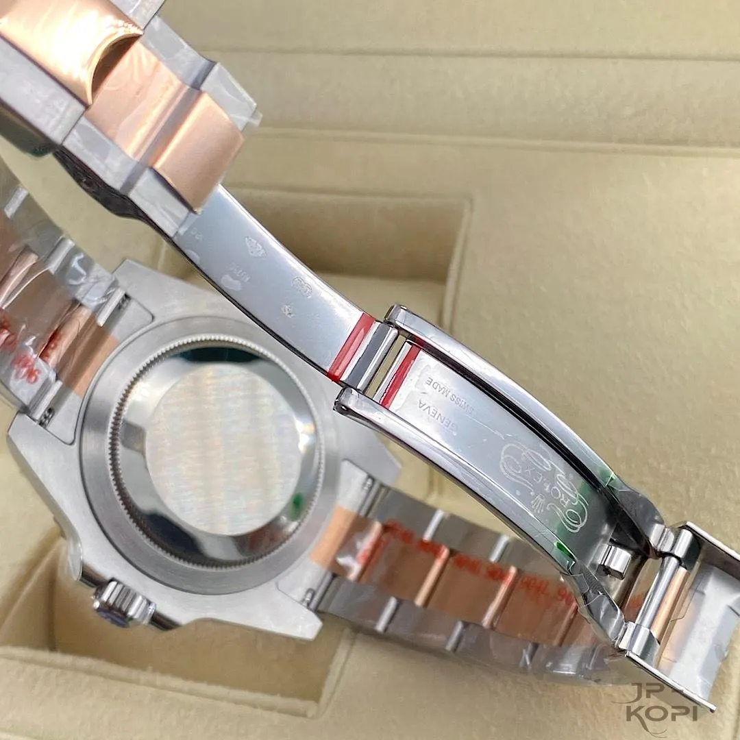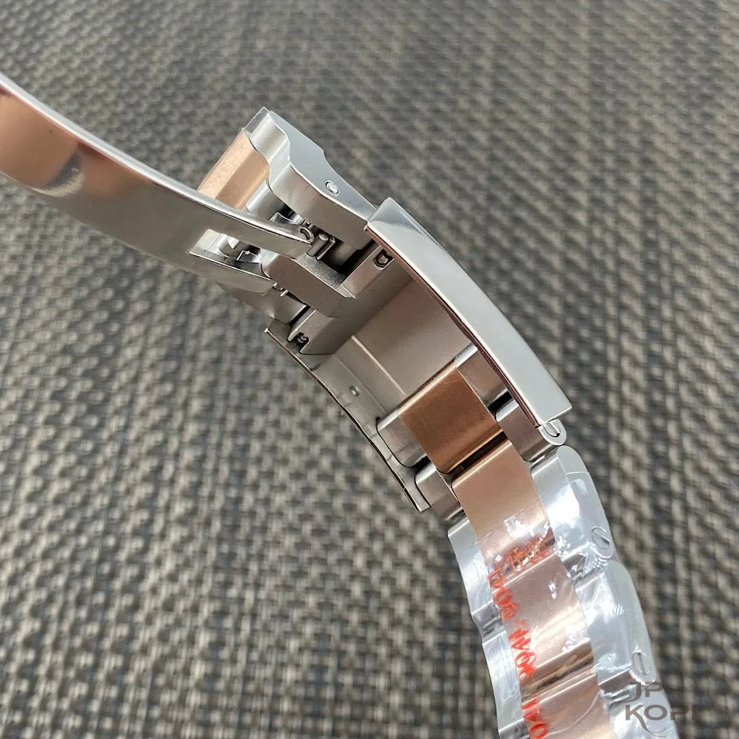 ケースとブレスレットには904Lステンレス+エバーローズゴールドメッキを使用し、高級感と耐久性を両立。