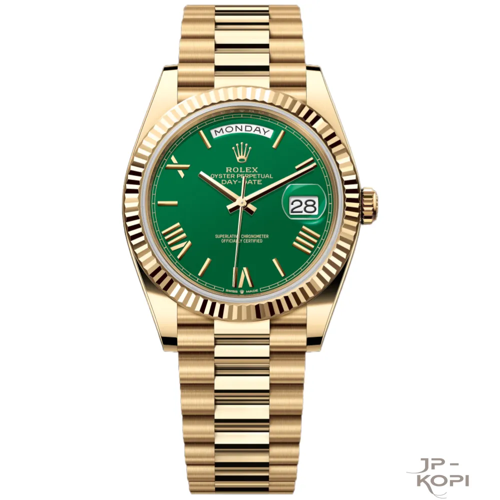 「ロレックス デイデイト 40 228238-0061」は、深みのあるグリーンダイアルに上品なローマ数字インデックスを組み合わせたエレガントなモデルです。