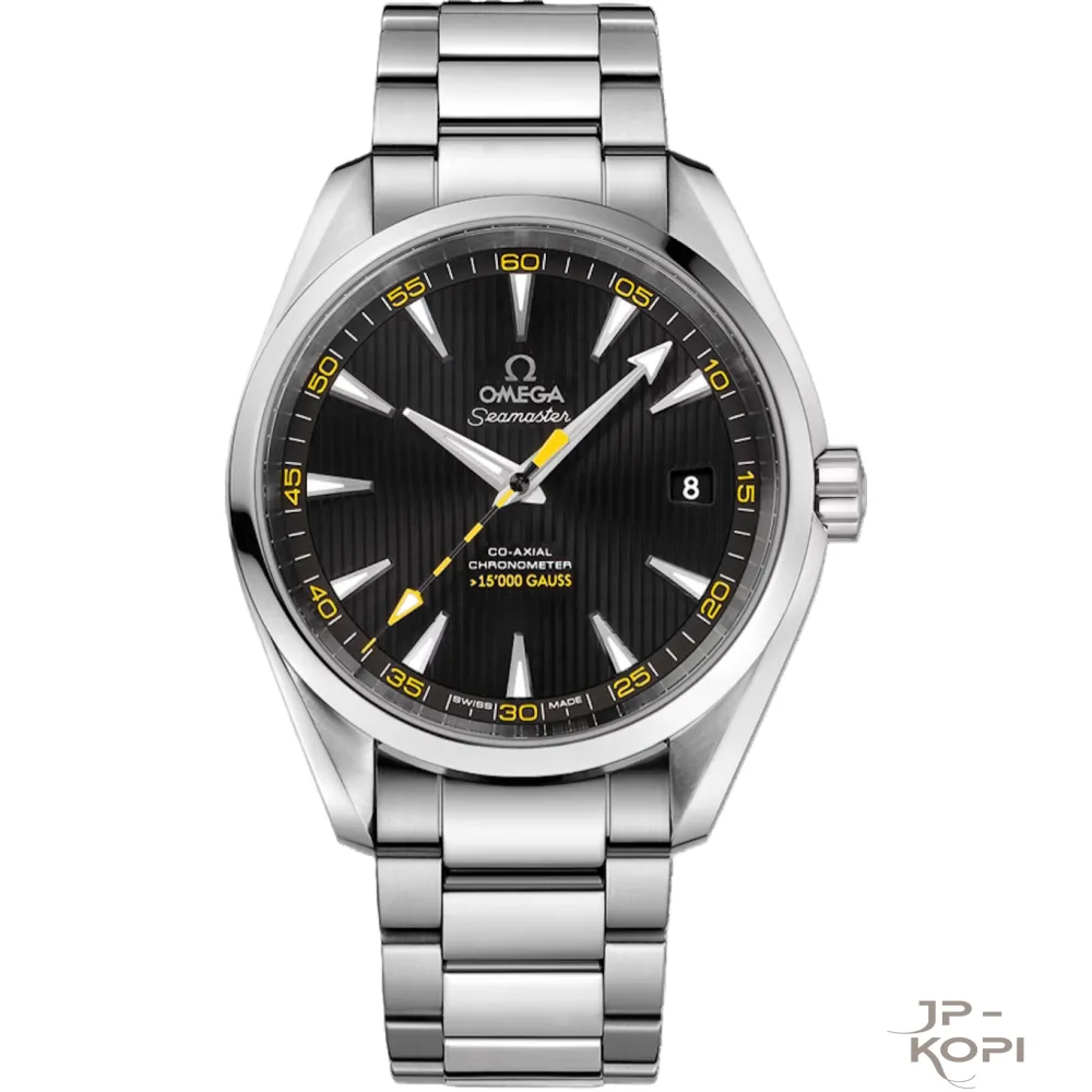 シックなブラックダイアルが印象的なオメガ シーマスター コーアクシャル アクアテラ クロノメーター 15000ガウス(L)(Ref.231.10.42.21.01.002)。