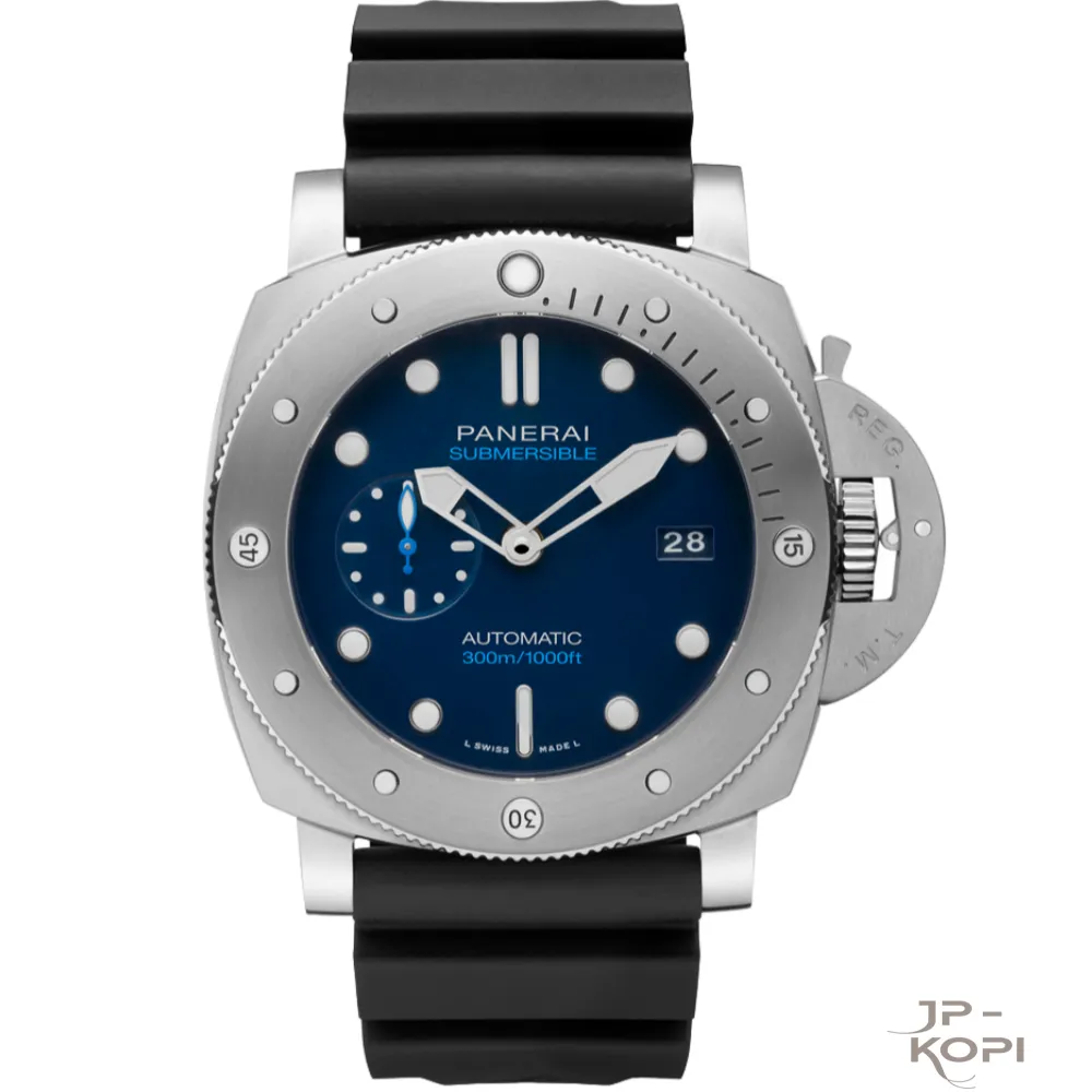 鮮やかなブルーダイアルと大型47mmケースが相まって、圧倒的な存在感を放ちます。