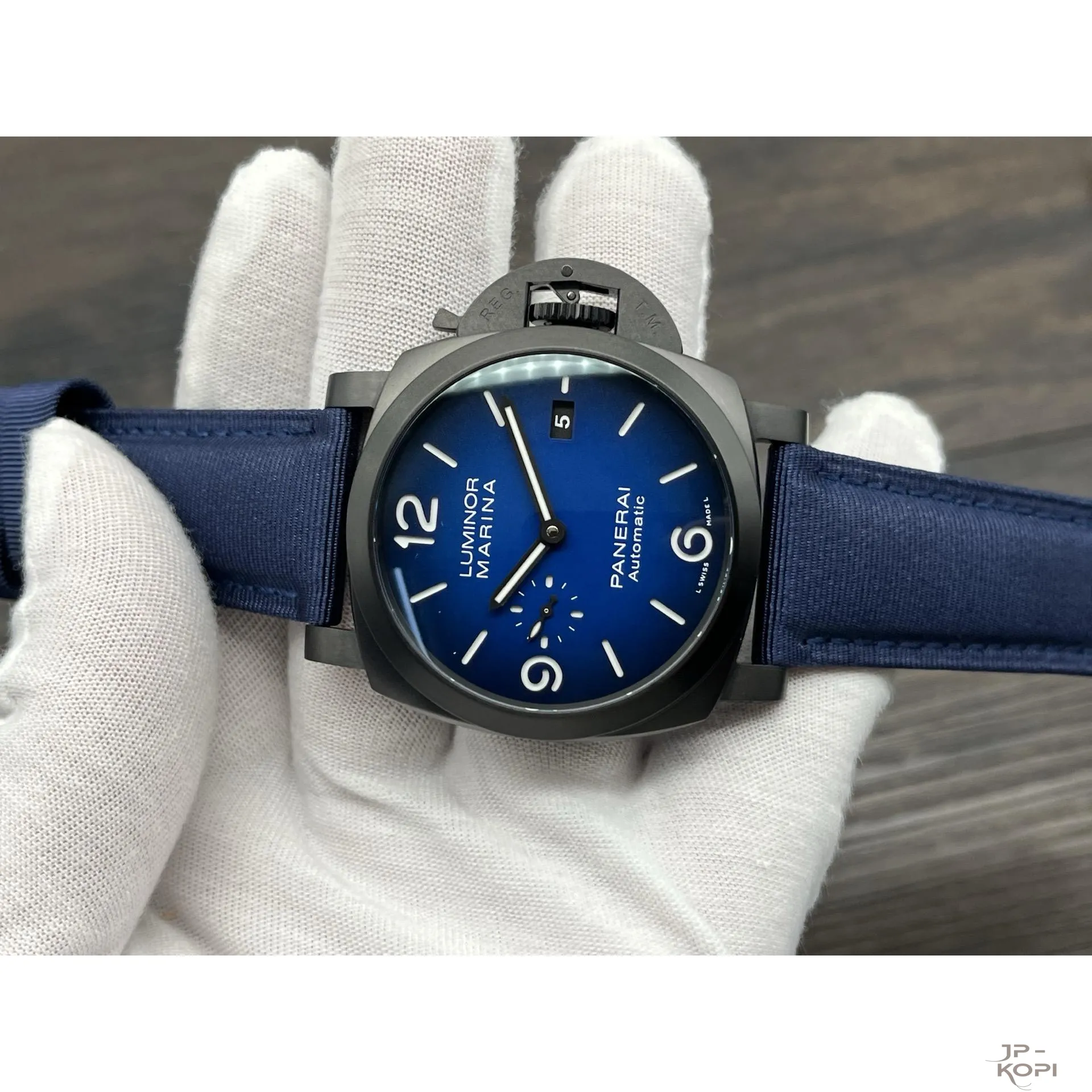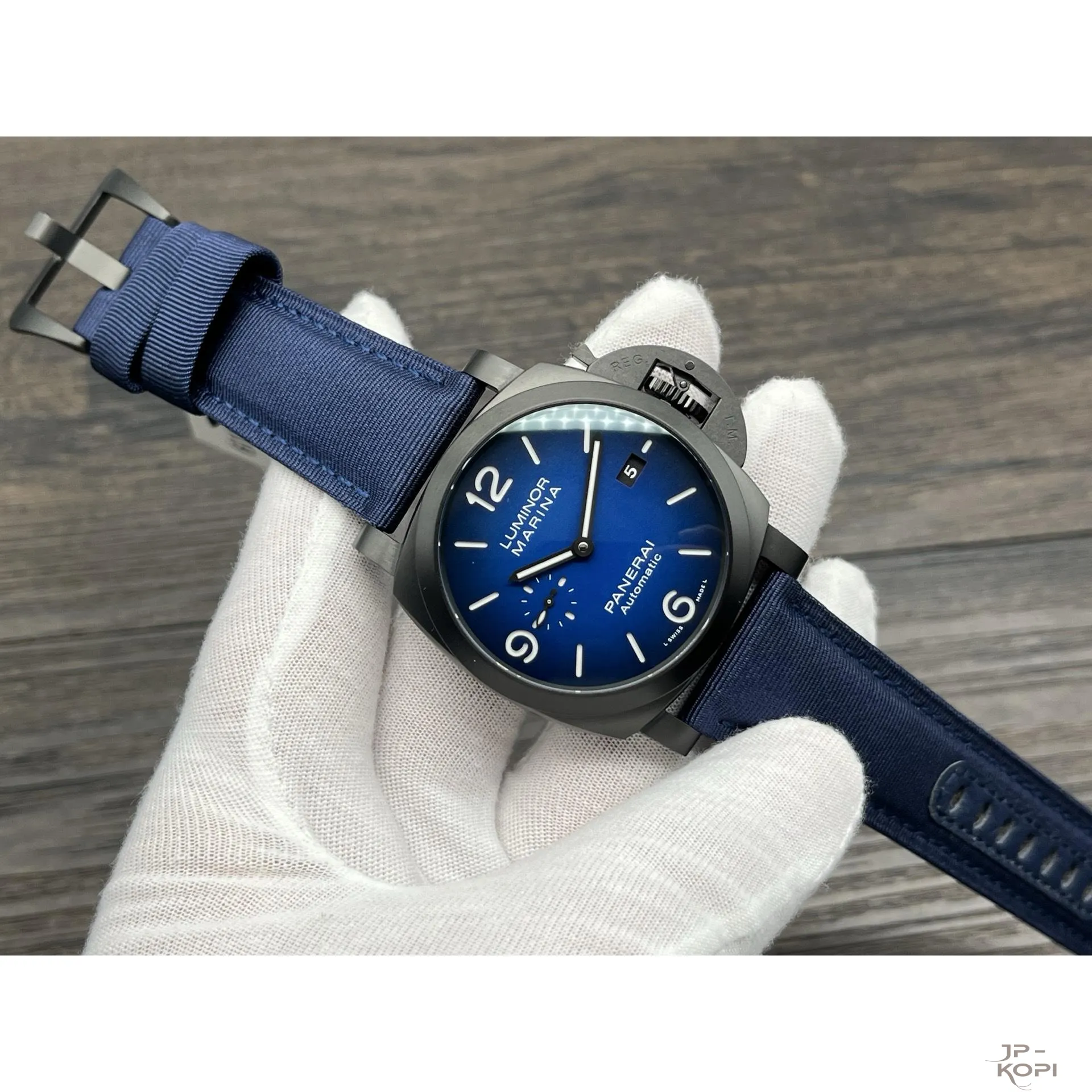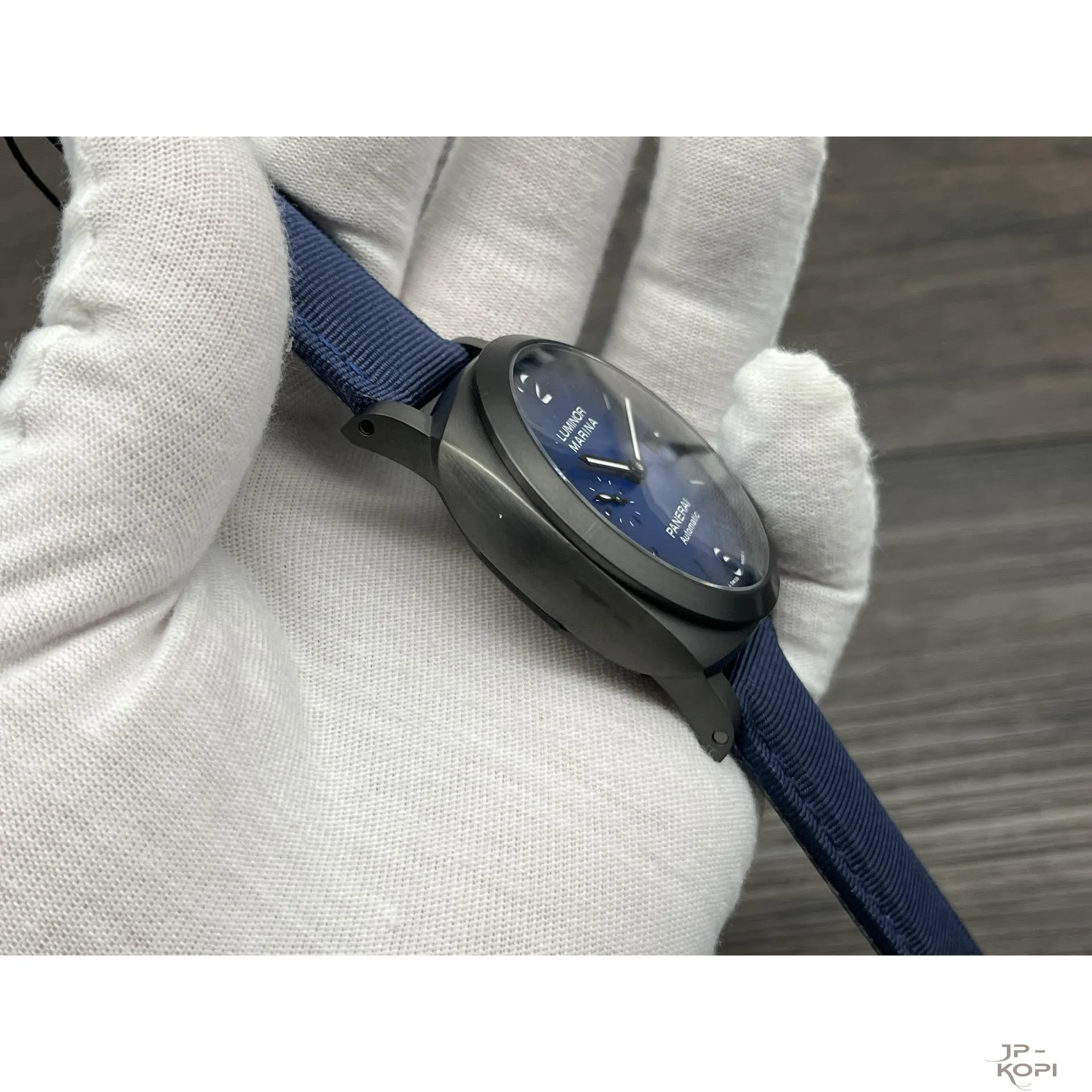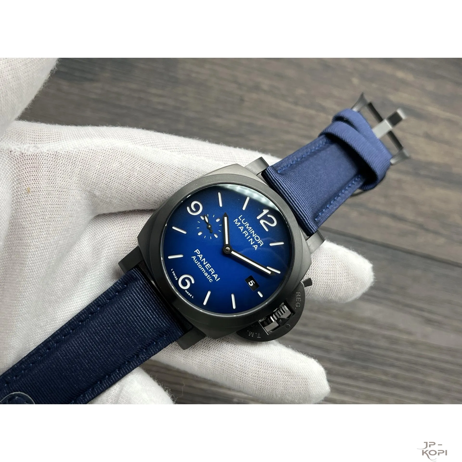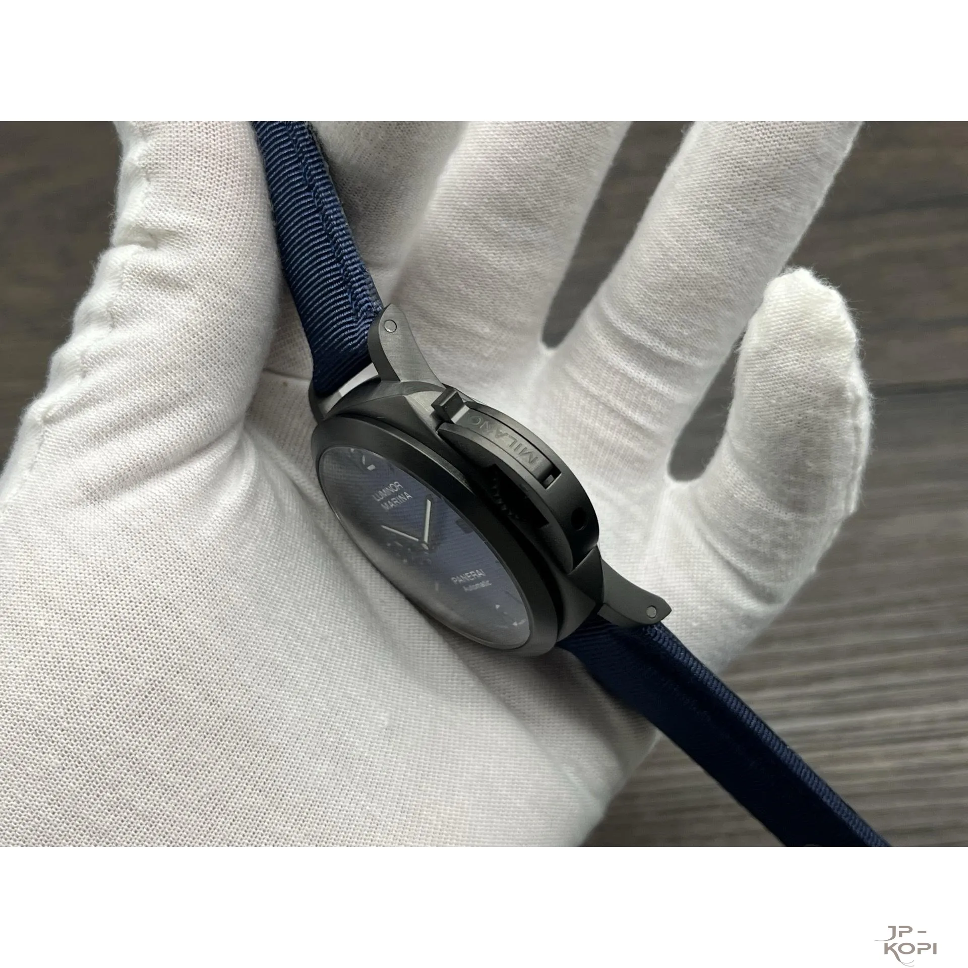 パネライ ルミノール PAM02319は、美しいブルーグラデーションダイヤルとDLCコーティングを施したケースが特徴の、力強く洗練されたモデルです。44mmの大型ケースが存在感を放ち、ダイバーズウォッチとしての機能性とスタイルを兼ね備えています。