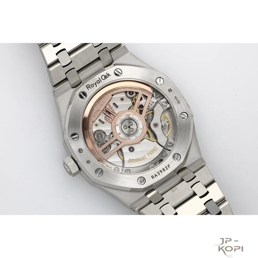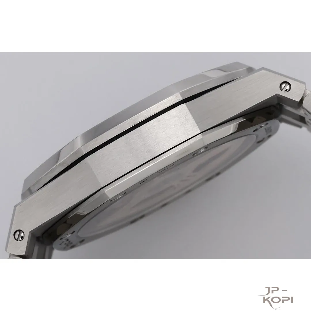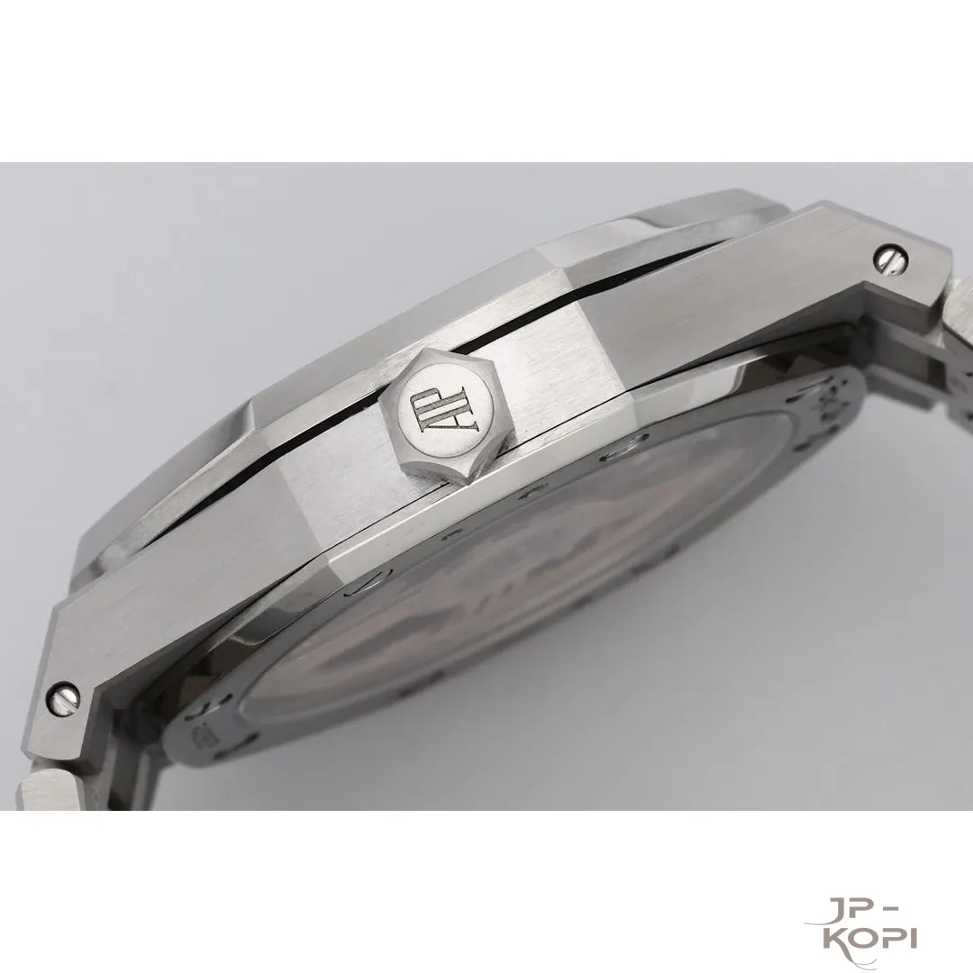 「ロイヤルオーク」の象徴的な八角形ベゼル六角形ビスを備えた41mmケースは、精緻なヘアライン仕上げと鏡面ポリッシュによって、力強さとラグジュアリー感を融合。ケース厚わずか10.5mmで、手首に自然にフィットします。