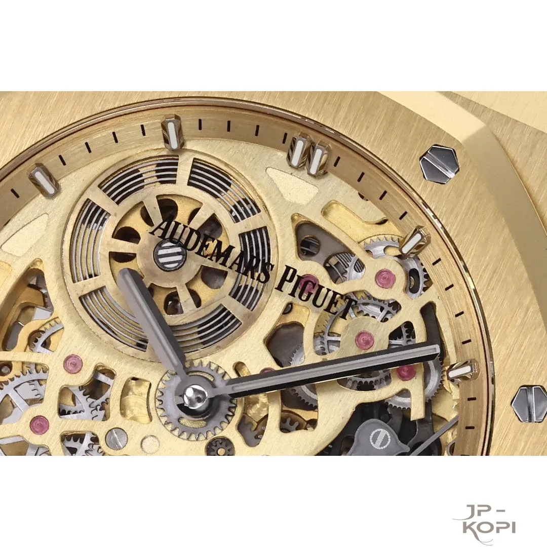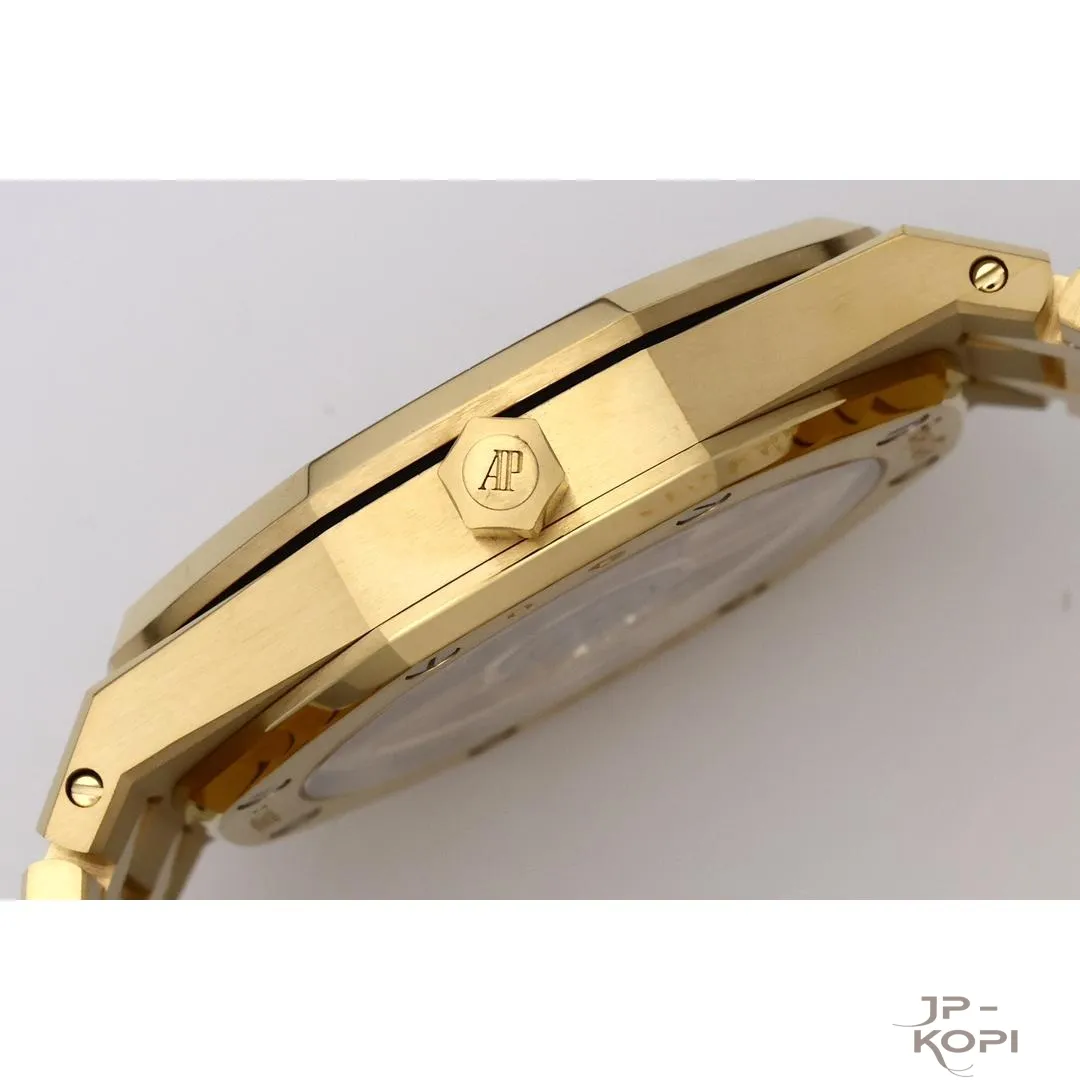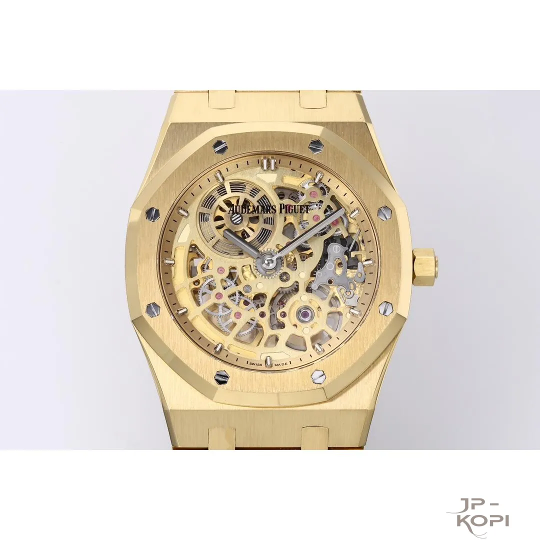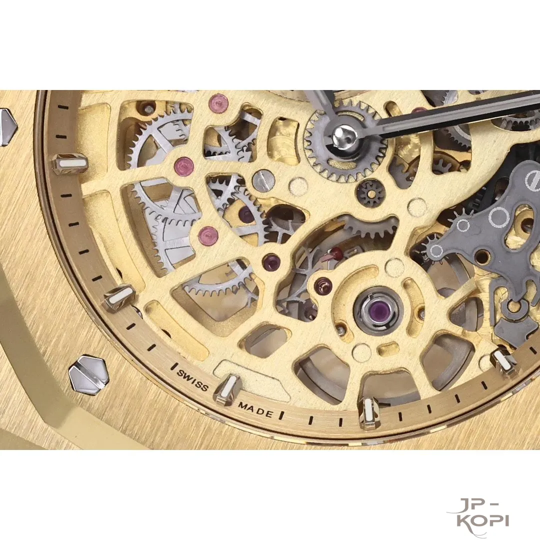 2022年にロイヤルオーク誕生50周年を記念して発表された正規モデル:cite[5]を忠実に再現。«ジャンボ»の愛称で親しまれるクラシックな**39mmケース**に、«エクストラシン(超薄型)»かつ«オープンワーク(透かし彫り)»という複雑な匠の技が結集しています:cite[5]。文字盤とムーブメントの境界を曖昧にした独創的なデザインは、正規品が持つ芸術性を**ZF工場製Cal.7124ムーブメント**で見事に再現しています。