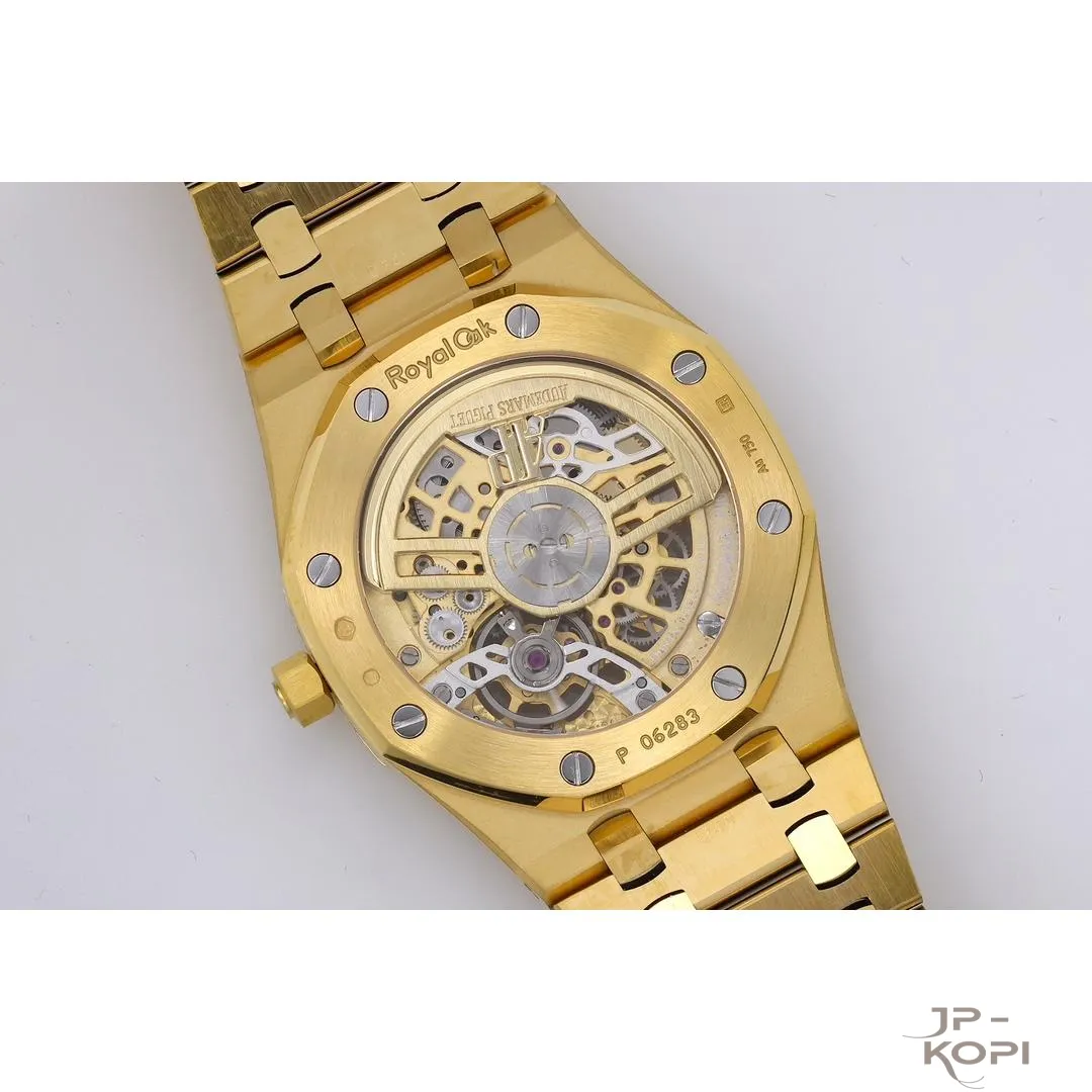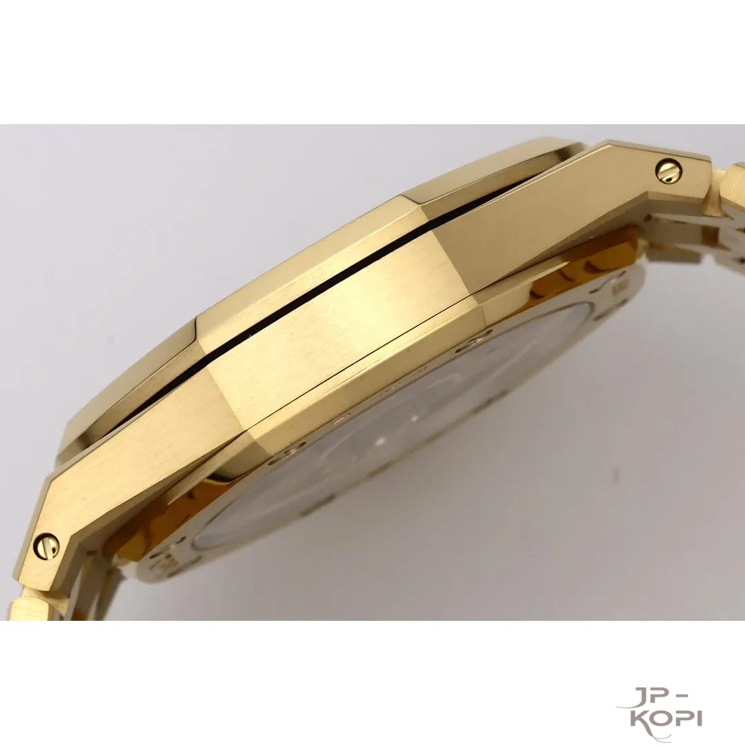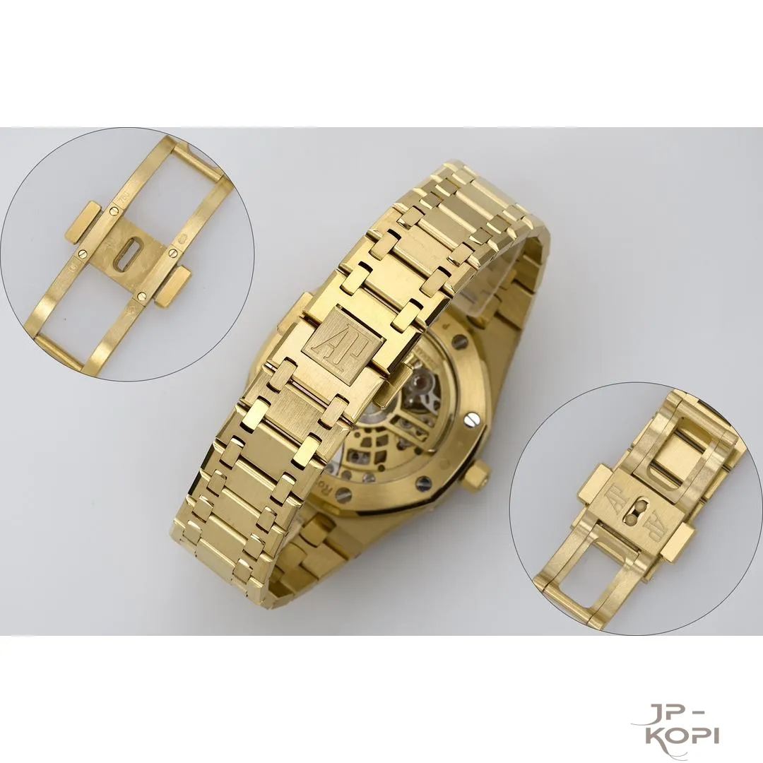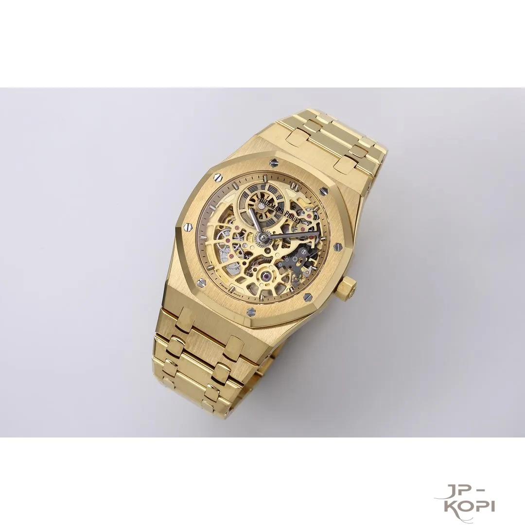 2022年にロイヤルオーク誕生50周年を記念して発表された正規モデル:cite[5]を忠実に再現。«ジャンボ»の愛称で親しまれるクラシックな**39mmケース**に、«エクストラシン(超薄型)»かつ«オープンワーク(透かし彫り)»という複雑な匠の技が結集しています:cite[5]。文字盤とムーブメントの境界を曖昧にした独創的なデザインは、正規品が持つ芸術性を**ZF工場製Cal.7124ムーブメント**で見事に再現しています。